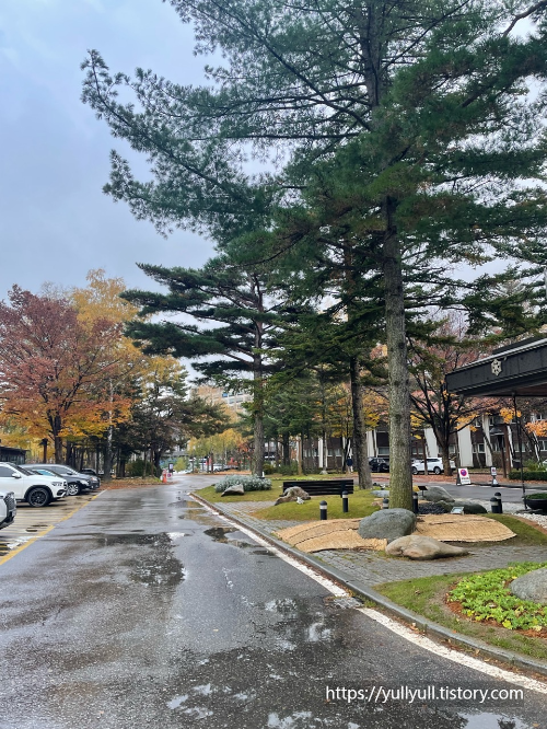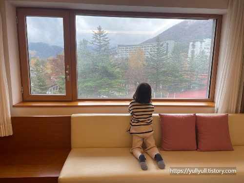 방에서 바라본 풍경이 너무 이뻐 또 한컷했어요. 스키장 뷰는 좀 더 좋은 룸이 었고 우린 이정도 뷰도 너무 좋았어요. 방은 더블 베드 1개, 싱글 베드 1개 붙여서 사용 했어요. 침대가드나 등등은 제가 따로 요청하지 않았답니다.