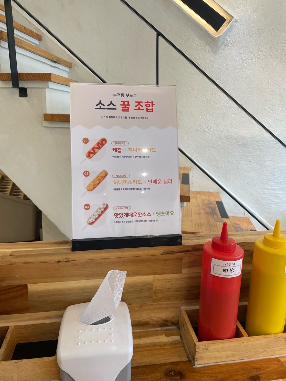 1층 매장 한편엔 소스가 종류별로 있답니다. 저희 알던 허니 머스터드, 케첩 외에 치즈 머스터드, 땡초 마요, 핫 소스, 칠리 등 7가지 맛이 있어요. 종류별로 골라 먹는 재미도 있을 것 같습니다. 저의 원팩은 치즈 머스터드 + 칠리 좋아합니다.