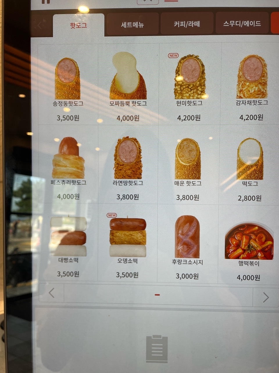 매장은 생각보다 넓어요. 주문은 키오스크로 하면 된답니다. 주문과 동시에 튀기기 때문에 조금의 대기시간이 있을 수 있어요. 핫도그의 종류도 아주 많네요. 가장 기본이 제일 맛있기에 기본 시키고 커피도 하나 시켰답니다. 음료의 가격도 나쁘지 않네요. 밖이 워낙 푹푹 쪄서 딸과 저는 실내에서 먹기로 했어요.
