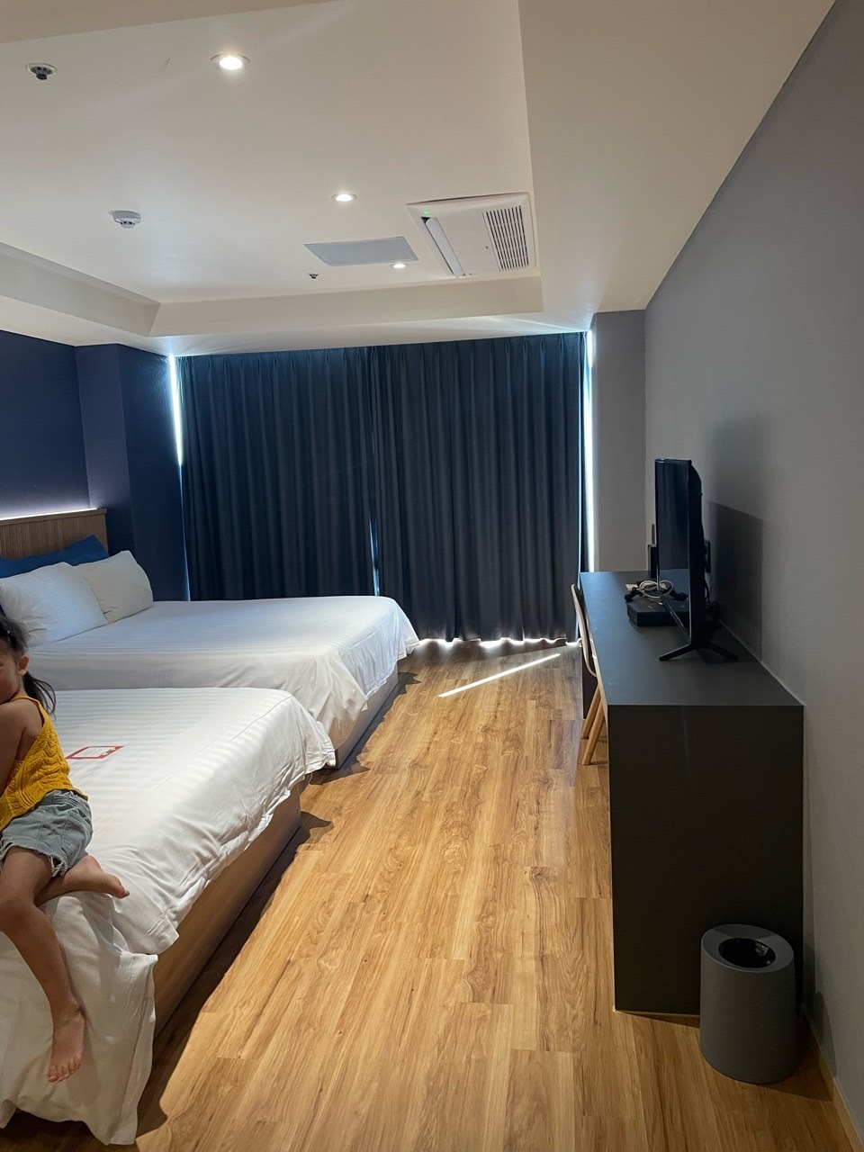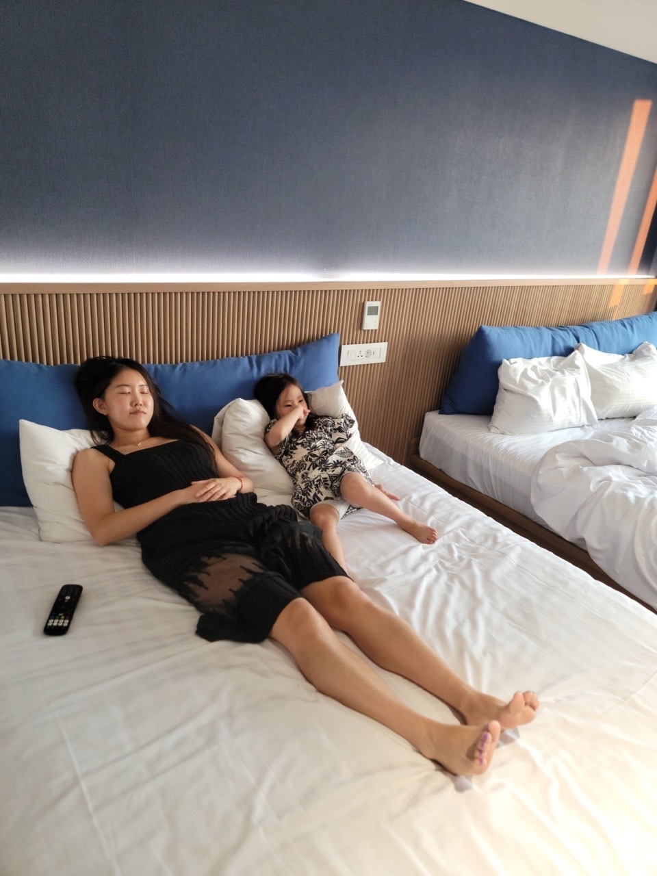 간만의 호텔이라 딸과 매우 신난 모습입니다. 집이 코앞이지만 너무 좋네요. 침대도 푹신하고 베개도 높지 않아요. 전 호텔의 높은 베개가 세상 불편하답니다. 잠을 잘 못 자요. 딱하나 불편한 점이 있네요. tv가 작아요. 뭐 볼일이 있겠냐 만은 그래도 작습니다. 아! 불편한 점 하나 더 있어요. 밤 되니 시끄럽네요. 호텔 내부가 시끄러운 게 아니라 상권 중심에 있다 보니 해운대 해수욕장과 상권의 소음이 20층이라도 조금 들려요. 왜 밤이 됐는데 다들 자러 안 가고 저러고 있는지 모르겠습니다. 해운대 해수욕장 바로 앞의 아파트는 아닌 거 같네요.(이사 오려 했답니다.)