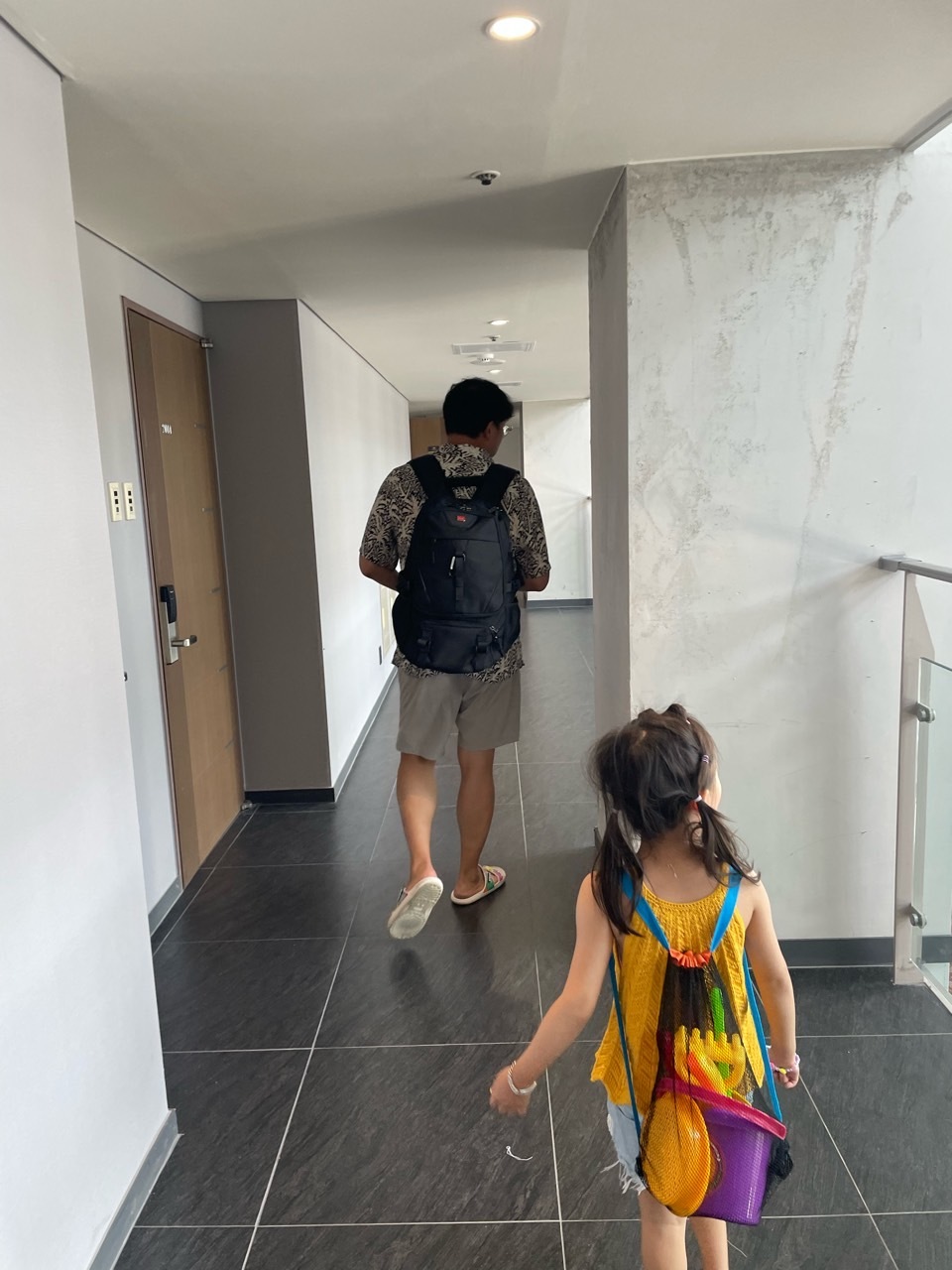 저희 가족은 20층으로 배정받았어요. 엘리베이터는 30층까지 있네요. 20층도 나름 고층이라 만족했어요. 방으로 가는 길의 복도는 오피스텔 느낌 가득이었어요. 복도는 전혀 냉방이 되고 있지 않았답니다.