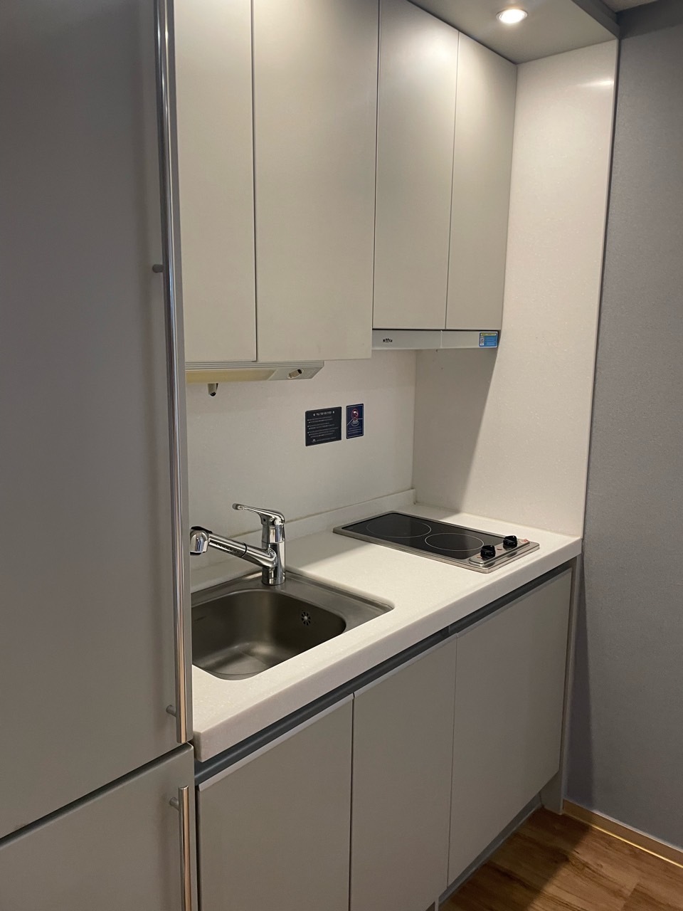 생각보다 매우 넓은 모습이에요. 싱크대까지 있어서 리조트 느낌도 납니다. 신발도 입구에서 벗고 들어가네요. 식기가 없다는 얘기를 들었는데 냄비 하나와 식기 몇 개와 수저가 있습니다. 간단히 라면 정도는 먹을 수 있을 것 같아요. 설거지를 안 하고 가면 2인에 11000원이 부가된다고 적혀 있습니다. 딱히 먹을 일이 있을까 만은 밤에 간단히 야식 먹기 좋을 것 같아요. 전자레인지는 4층 리셉션에 있습니다. 침대도 매우 넓어서 아주 편안해 보이네요. 시설은 최신식 느낌은 아니지만 깔끔하게 아주 관리가 잘 되어 좋아 보입니다. 투숙하기엔 전혀 문제가 없어 보여요.