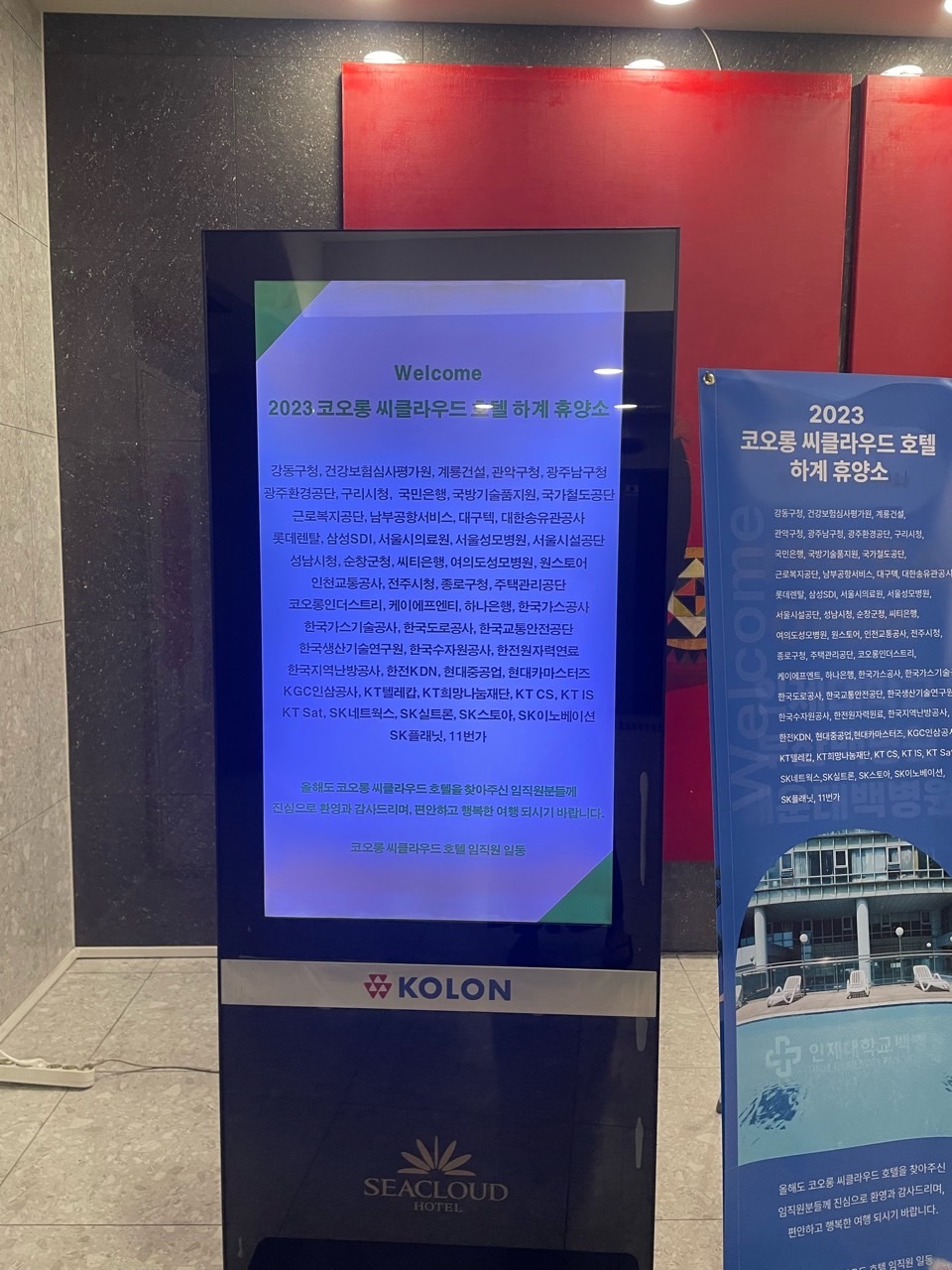 엘리베이터는 지하주차장에서부터 6층까지 있고 4층에서 고층으로 갈 땐 다른 엘리베이터로 갈아타야 하는 불편함이 있답니다. 저흰 4층에 내려 체크인을 하였답니다. 보니 씨클라우드 호텔이 많은 회사에서 하계휴양소로 이용되고 있네요. 서울에 있는 회사들이 많이 보이는 걸 보니 휴가로 해운대 내려오면 참 좋을 것 같았답니다.