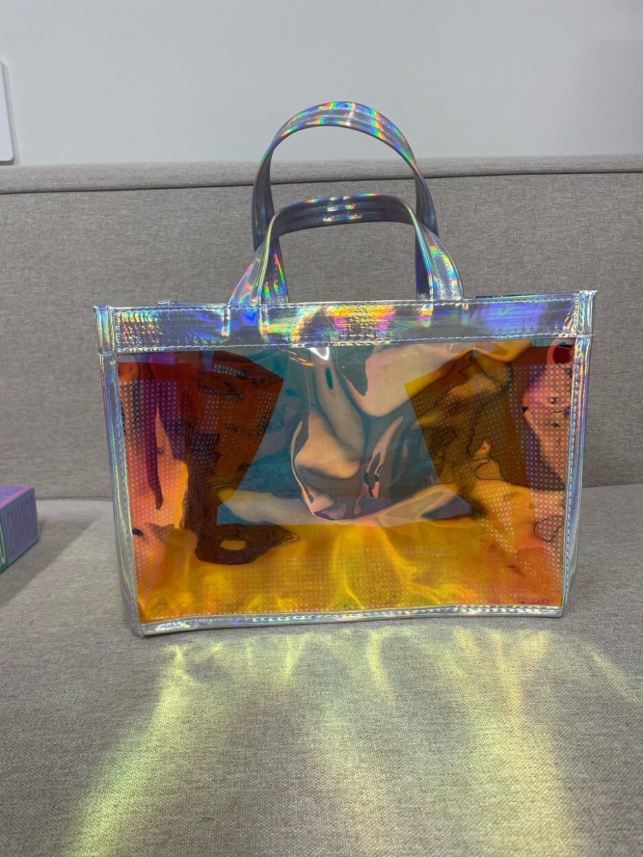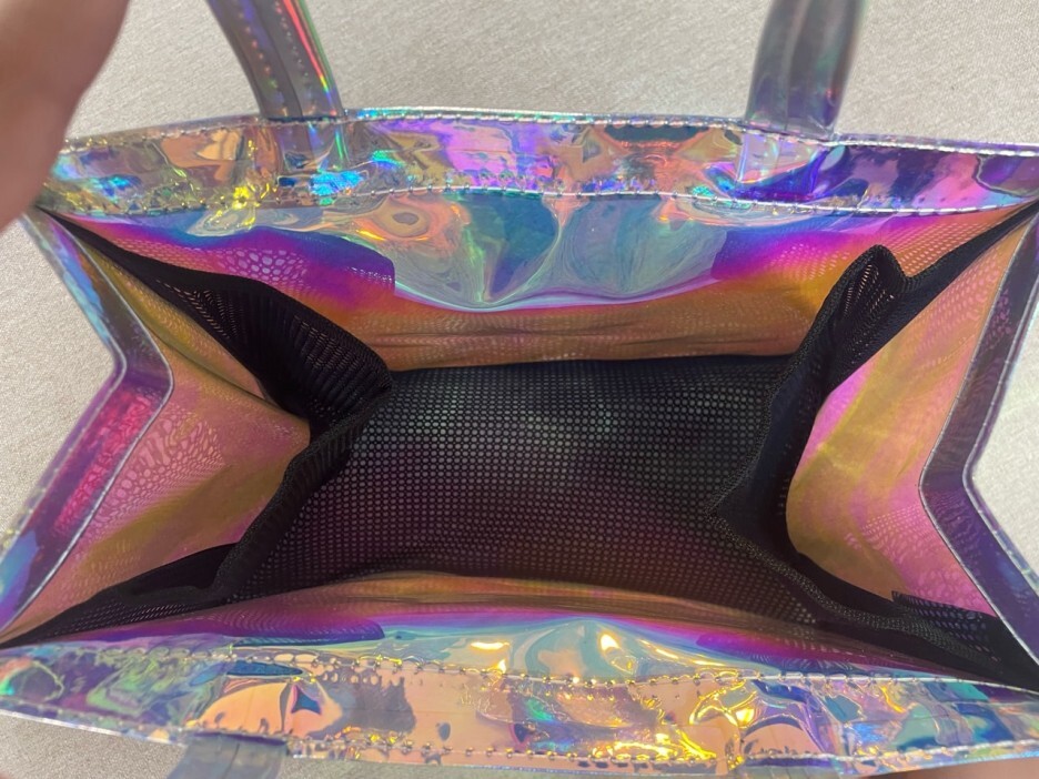 바깥은 불투명으로 홀로그램으로 되어있고 맨 밑바닥은 물 빠짐이 용이하게 매시로 되어있어요. 양옆도 매쉬포켓이 있어 물건 넣기가 용이합니다. 이 가방 하나로 세면용품, 수영복, 수경, 수건, 로션까지 다 들어가네요. 지금 현재 아주 잘 쓰고 있어요. ( 제 타임에 수영 강습 받는 분 중 제 가방이 가장 이뻐요!) 저는 19000원 줬는데 인터넷을 보니 현재 22000원으로 소폭 인상했습니다..