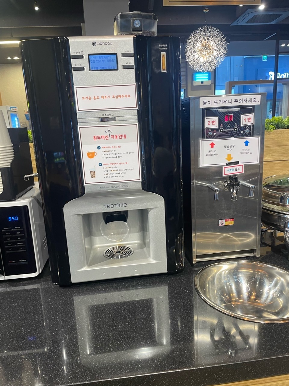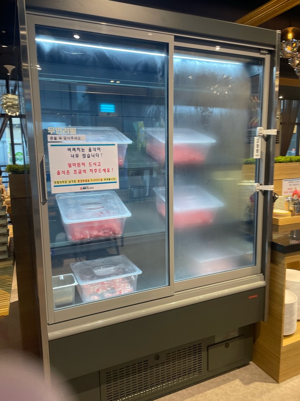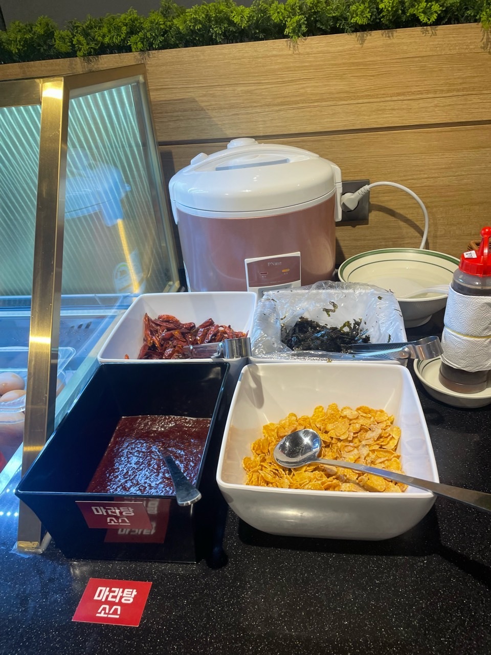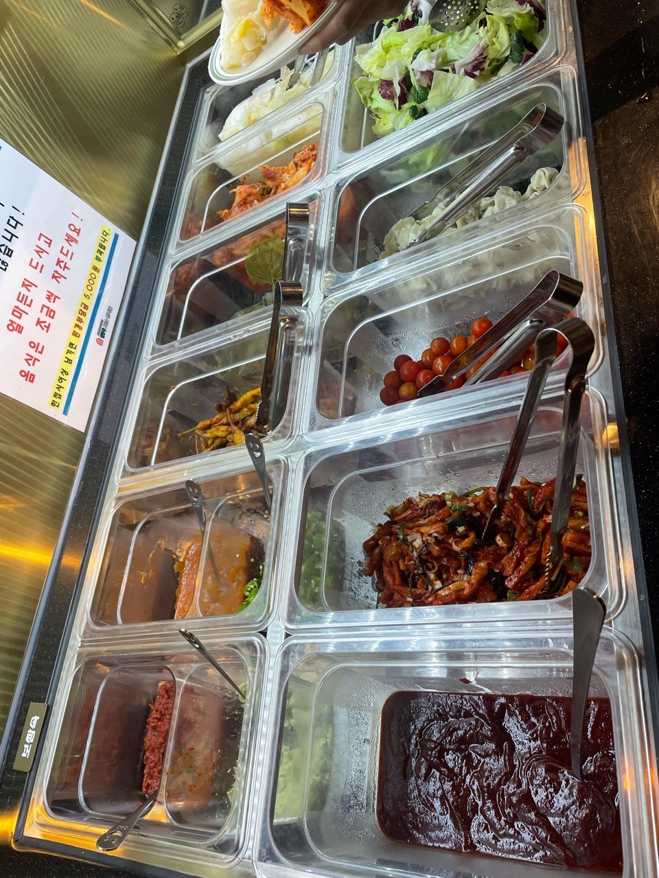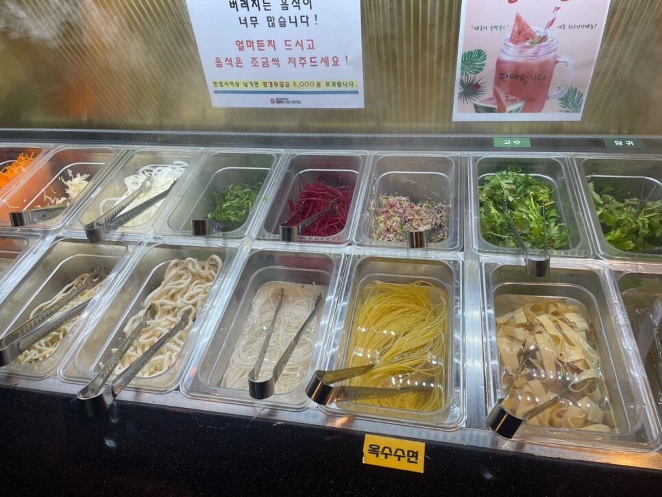 샐러드바에는 딱 많이 먹는 음식들만 있습니다. 샤브샤브 집을 가면 피자, 떡볶이 등등 샐러드바에 음식들이 많은 데 배불러 오히려 샤브샤브가 맛이 없게 느껴지는 경우가 있은데 이곳은 오히려 음식 종류가 적어 전 더 좋았어요. 야채가 많고 사리가 많이 보이네요. 요즘 핫한 마라탕 소스도 있어서 지겨우실 땐 마라탕처럼 드셔도 되고 고기와 함께 쌈 싸 먹기 좋은 무말랭이, 고추장아찌 등 보쌈 재료가 보입니다. 다양하게 고기를 맛 볼 수 있을 것 같네요. 디저트도 커피만 딱 있는 것도 좋아 보입니다. 오히려 이런 재료를 아껴 고기에 더 투자하는 느낌입니다.
