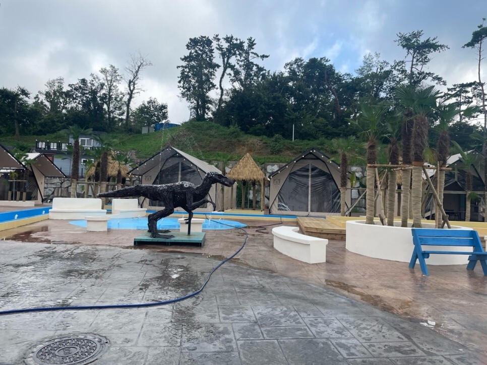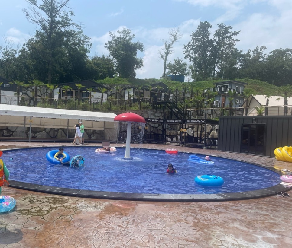 으로 어마어마한 크기랍니다. 방갈로, 글램핑 이용 고객들이 많아도 부딪힐 염려 없이 놀 수 있는 크기랍니다. 풀도 총 3개로 되어 있고 제일 큰 메인 수영장, 작은 수영장 2개가 있는 데 하나는 따뜻한 물, 하나는 미온수 입니다. 그래서 추워하는 아기들은 작은 풀에서 놀기 딱 좋아요. 깊이는 성인 기준 종아리까지 온답니다. 아이들이 놀기에 딱 좋겠죠?