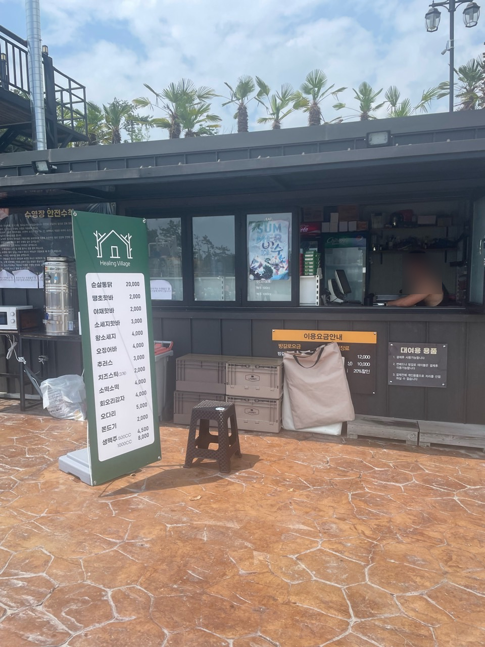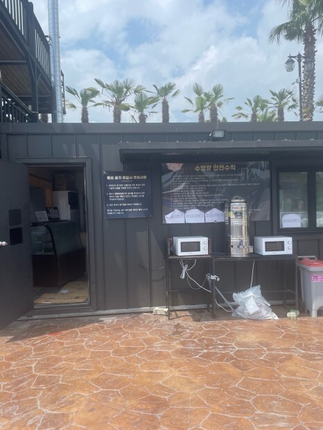 또 수영장 입구에 작은 매점이 있어 수영장 티켓과 함께 간단한 요리와 아이스크림, 과자 등 판매하고 있어서 사 먹기가 딱 좋답니다. 이곳에서 생맥을 팔고 있었어요. 저희 또 못 참잖아요. 가격도 그리 비싸지 않아 사 먹기 좋았답니다. 그리고 뜨거운 물이 입구에 비치되어 있어 방갈로 이용 고객들이 컵라면 먹기가 좋았답니다. 전자레인지 또한 입구에 있어서 햇반 등 이용하기 좋아요.