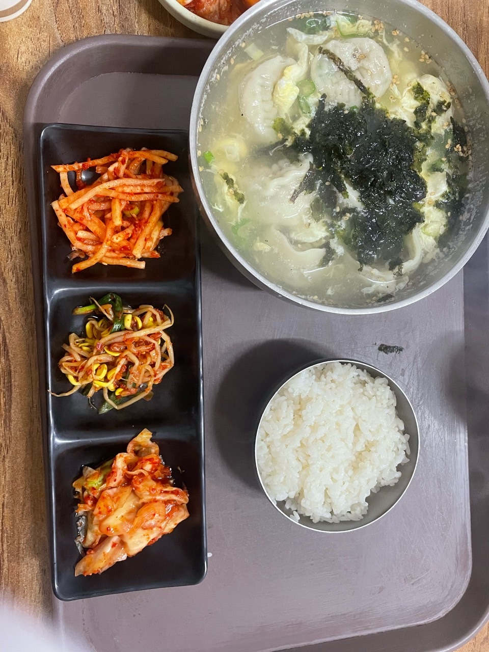 만두 백반도 너무 괜찮았습니다. 기본 멸치 육수에 계란 풀고 참기름 한 방울 들어가 딱 고소하고 맛있었어요. 이 국물은 땡초를 넣지 않아 아이들이 먹기 딱 좋았답니다. 손 만두도 5개 정도 들어가 있고 다 먹으니 아주 배불렀답니다.