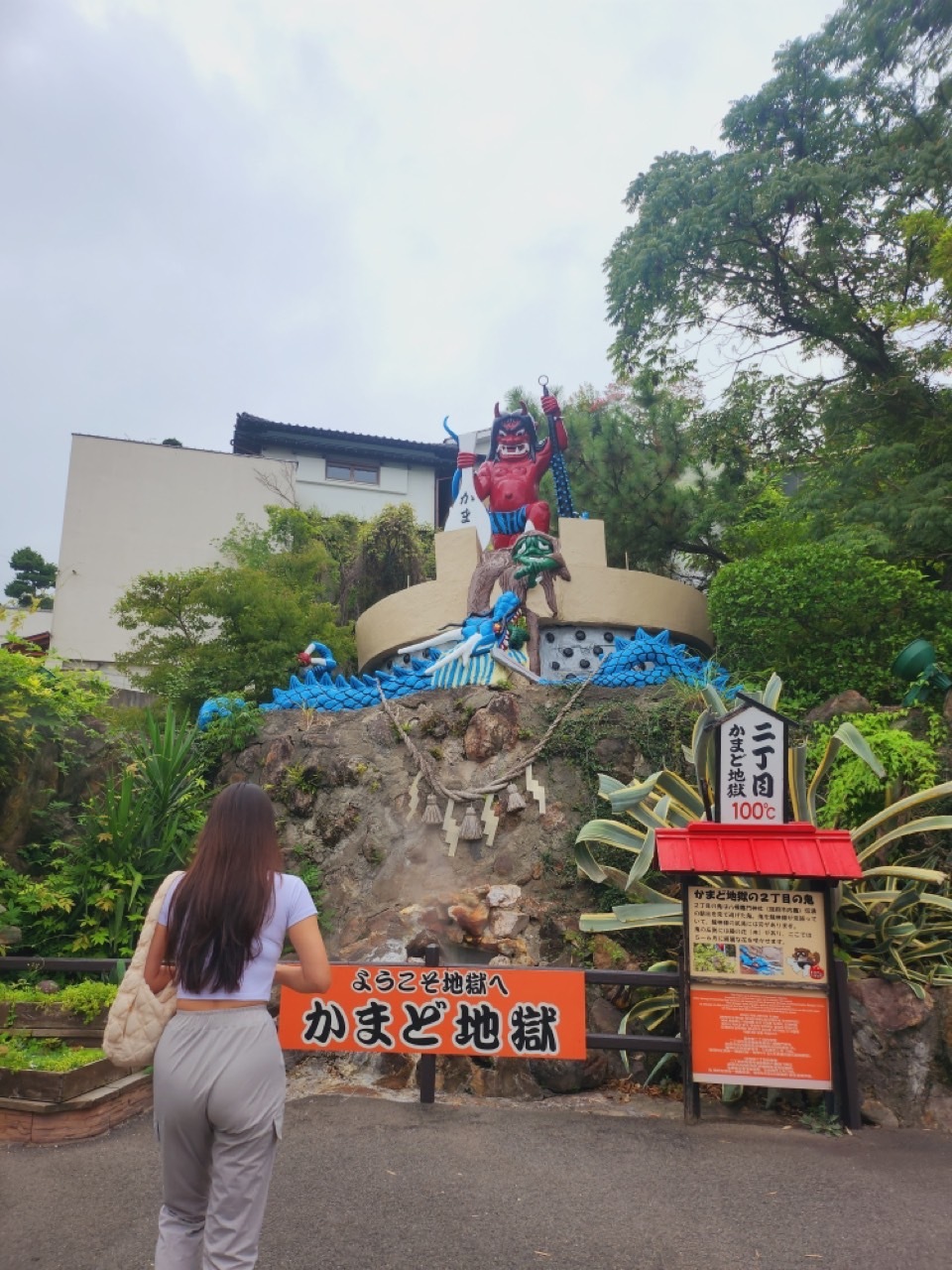 입구에 도착하니 아주 유명한 도깨비에 가마솥이 보이네요. 다들 이걸 찍으러 간 거겠죠? 안쪽에 가면 더 큰 가마솥이 나온답니다. 저흰 1회 권만 할 예정이라 1인당 450엔 내고 입장하였습니다.