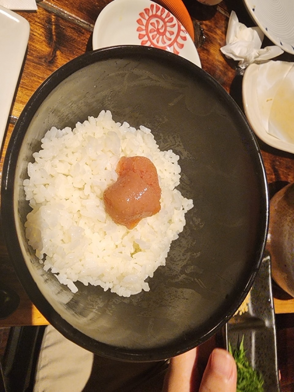 명란밥이 있어 시켜보았는데 따뜻한 차와 함께 먹는 밥이었어요. 저희 보리굴비를 녹차물에 말아 먹는 그런 셈이죠. 이 뭐라고 왜 이리 맛나죠. 명란은 짜지 않고 담백하고 감칠맛이 넘쳤고 같이 곁들여 먹으니 간도 적당하고 딱 좋았답니다.