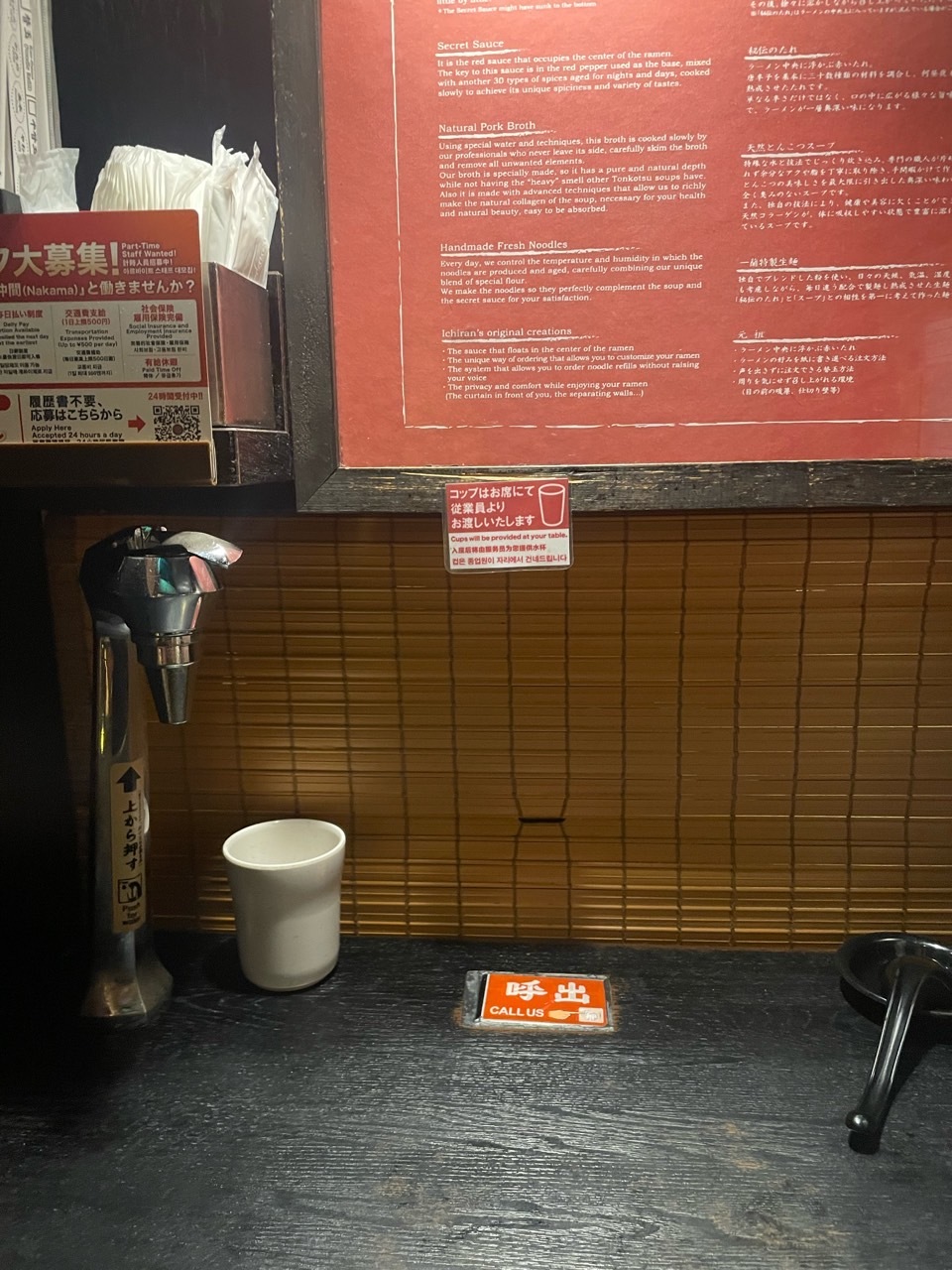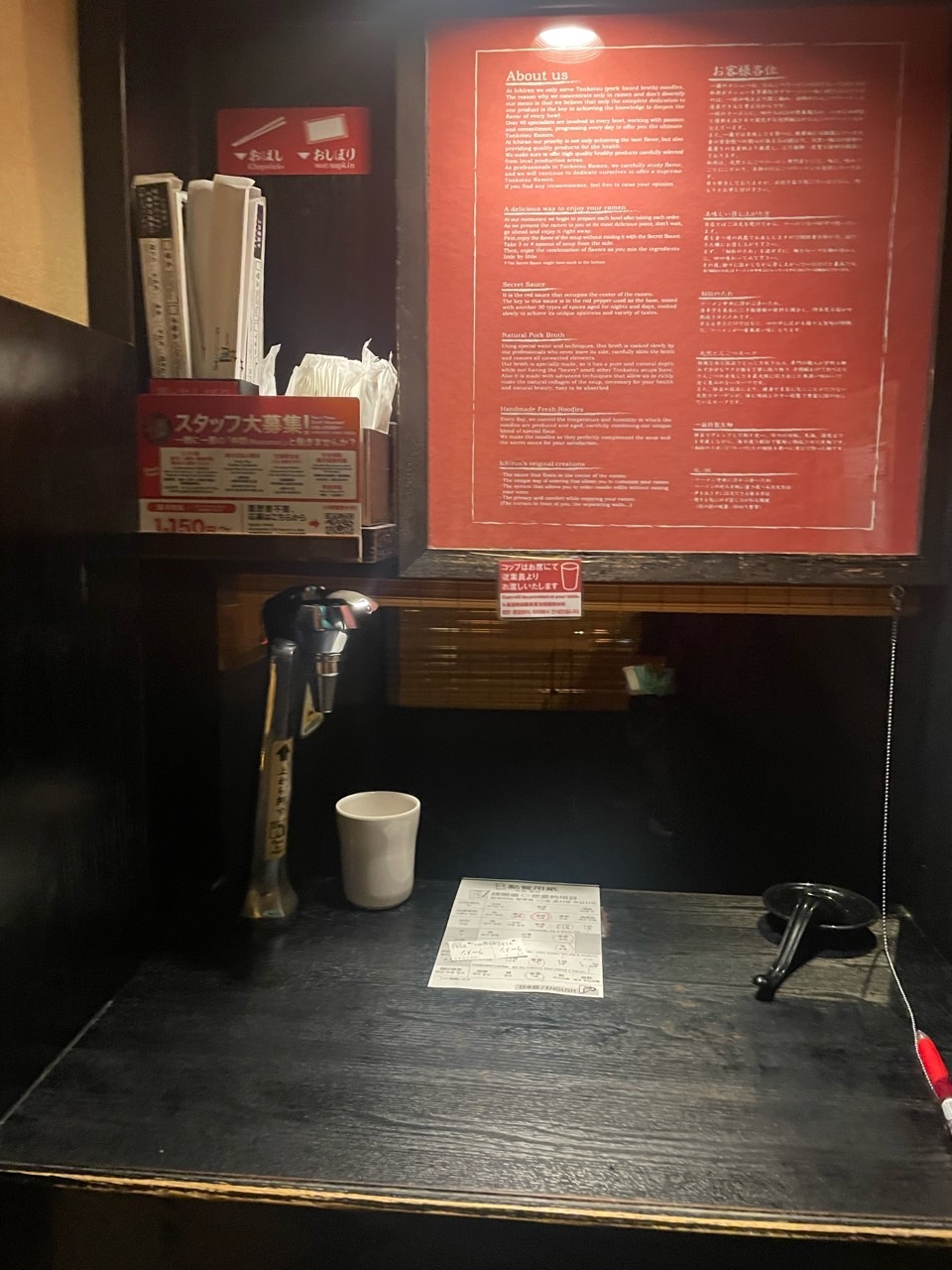 너무 웃기죠? 이게 이치란 라멘의 특징이랍니다. 혼밥 하기 너무 좋은 구조로 되어 있어요. 반대로 일행이랑 와도 제대로 말 한마디 못하고 밥만 먹어야 한답니다.