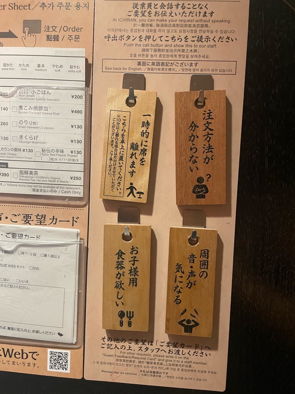 직원들에게 문의를 하고 싶으셔도 말하지 않아도 된답니다. 이렇게 팻말을 보여주면 된다고 하네요. 몇 번을 와봤지만 정말 진기한 풍경입니다. 음식이 나오고 다 먹고 나가기까지 매장 내부의 직원의 얼굴은 결코 보실 수 없을 거예요.