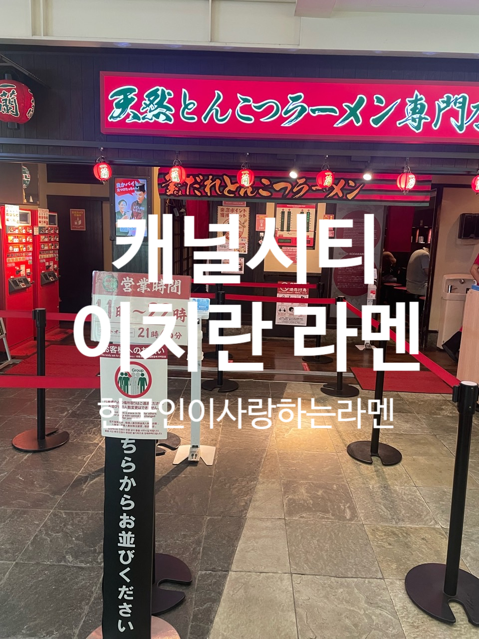 캐널시티 내 이치란 라멘은 24시간이 아닌 11시부터 밤 10시까지 운영되고 있네요. 이 빨간색 간판은 이치란 라멘의 시그니처랍니다. 일본 여행을 하다 보면 곳곳에 있는 걸 볼 수 있어요.