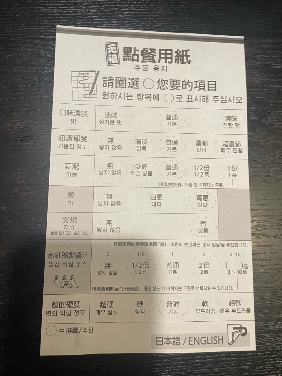 제가 사용하는 테이블입니다. 물을 마실 수 있는 수도가 있고 이렇게 종이가 있어요. 여기에 원하는 맛을 추가하면 된답니다. 무난하게 드시고 싶다면 기본 맛으로 다 하시면 돼요. 전 진하게 먹고 싶어서 국물 진하게, 마늘 많이로 선택했어요. 면은 기본으로 했어요. 기본 면이 조금 덜 익은듯한 느낌으로 뚝뚝 끊기는 면이 아주 좋답니다.