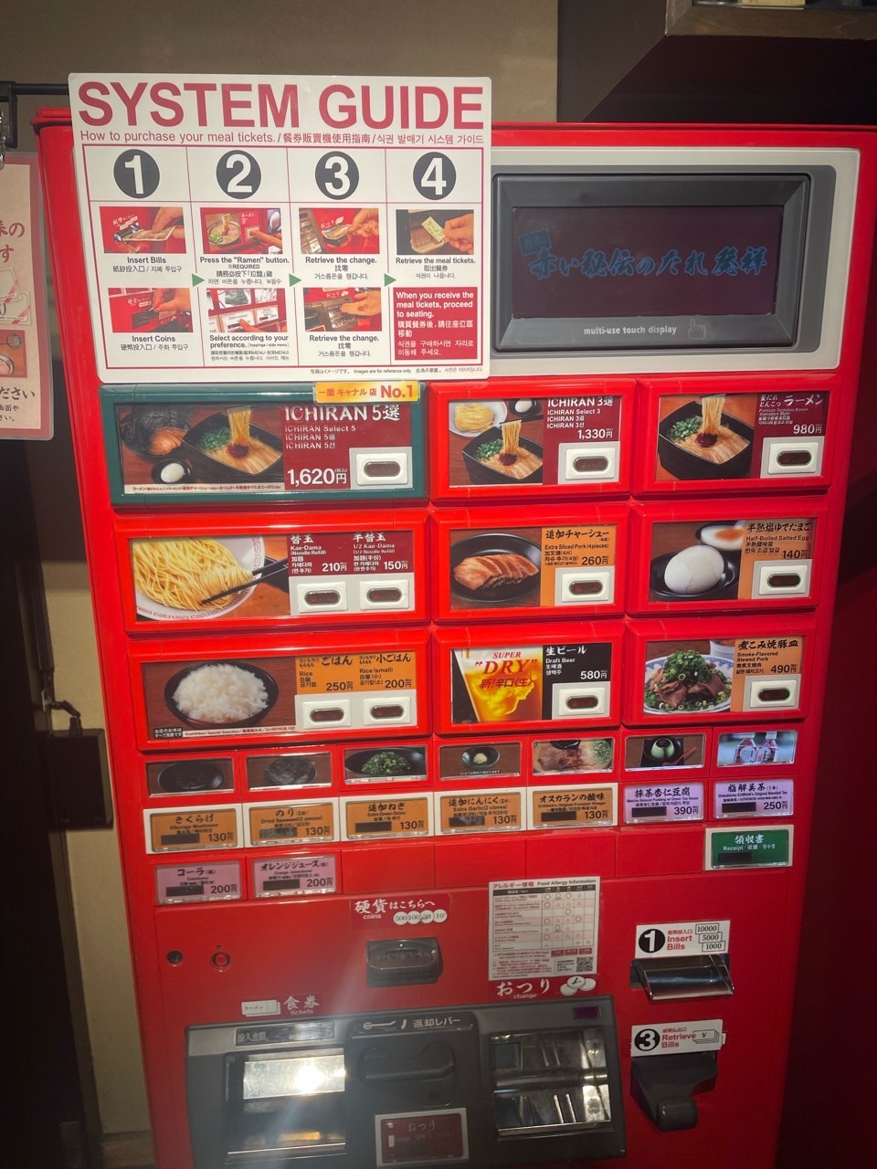 이렇게 한국인과 외국인 관광객이 많이 오다 보니 영어와 한글로 된 가이드가 있어요. 그리고 자판기로 원하는 메뉴를 선택하고 현금을 넣으면 티켓이 나와요. 이걸 들고 테이블에 가면 된답니다. 저흰 라멘만 단품으로 나오는 980엔짜리로 했어요. 라멘 치곤 싸지 않는 가격입니다. 카드가 안돼서 좀 그랬어요. 아직까지 카드 안 되는 곳이 있다니. 자판기로 아직 구매를 하다니 정말 일본스럽다고 생각했답니다.