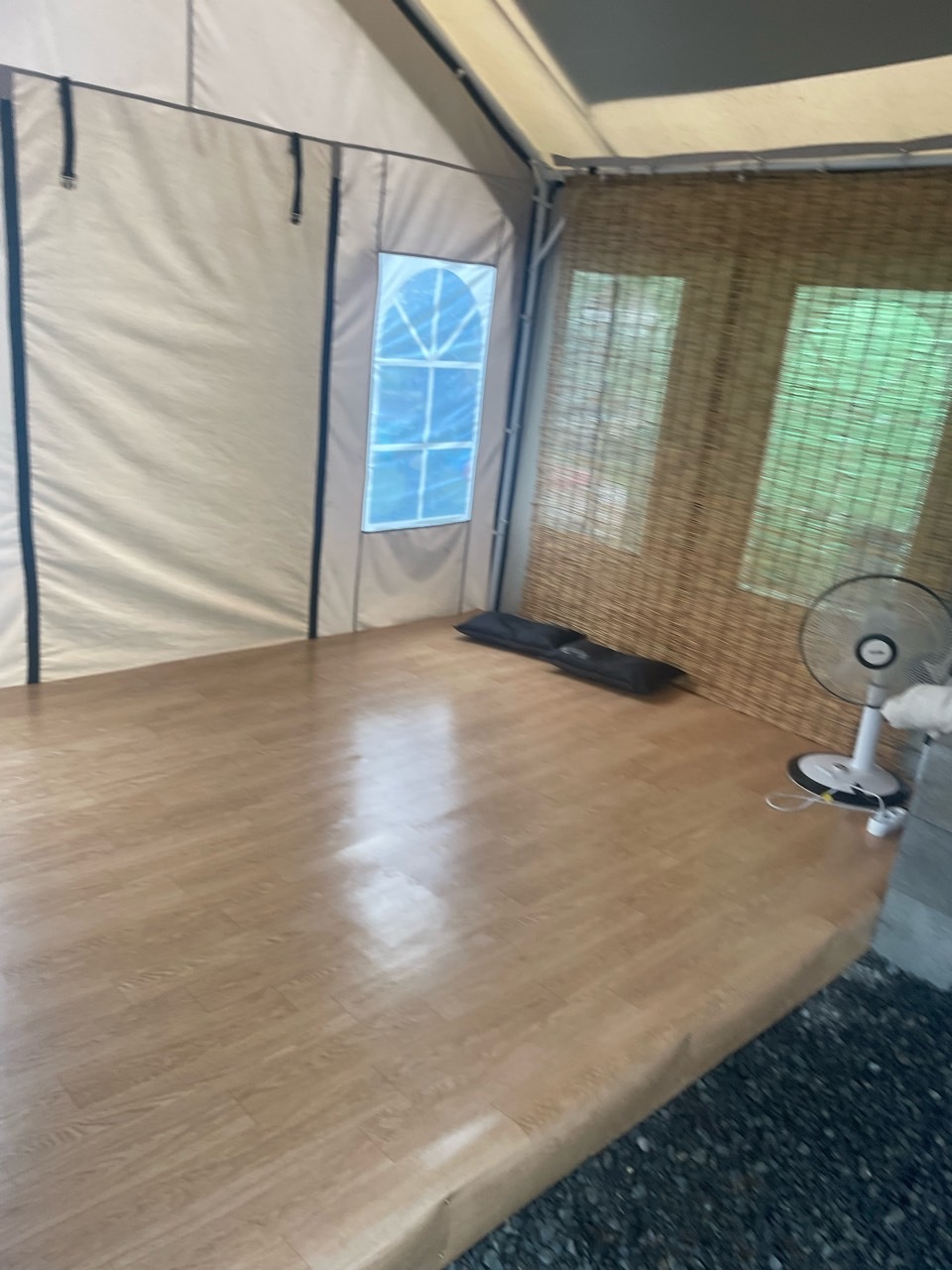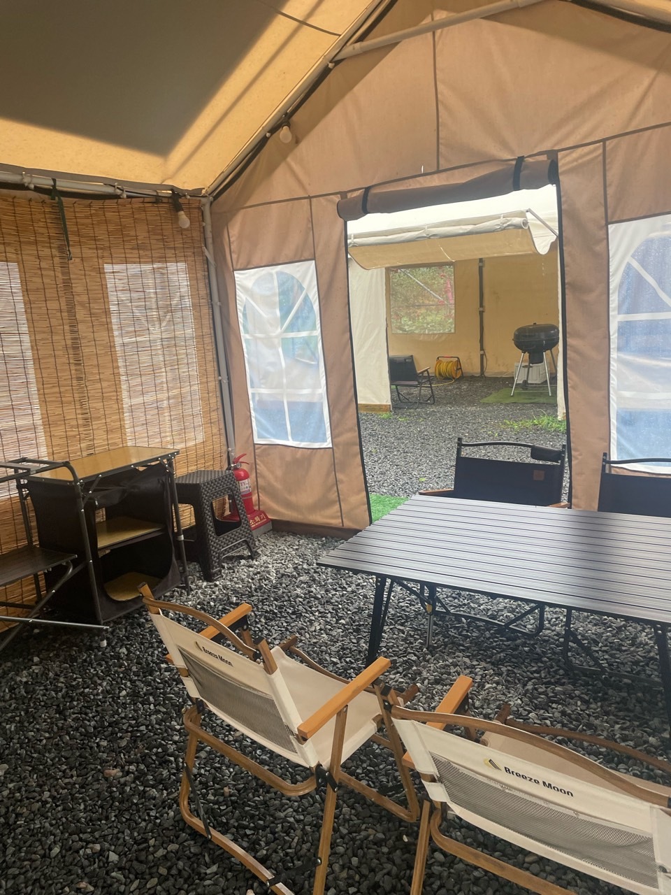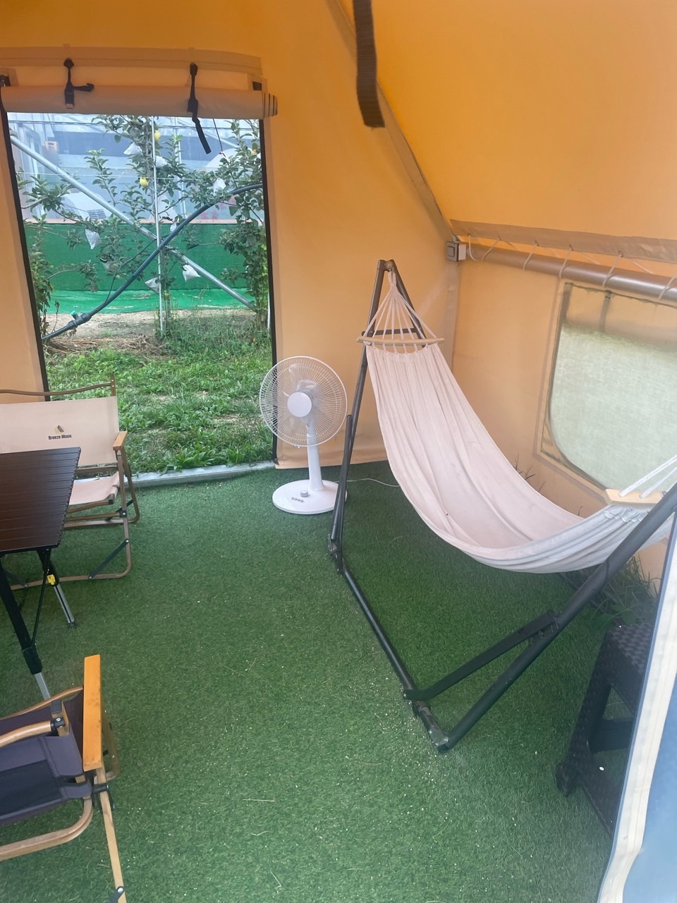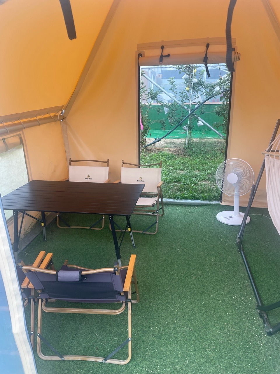 오늘 저희가 있을 곳입니다. 작지만 있을 것 다 있네요. 의자가 4개뿐이라 추가 인원이 있으시면 의자를 가지고 오면 될 것 같네요. 이날은 매우 꿉꿉해서 저흰 텐트에 별로 있지 않았어요. 선풍기를 틀어도 별로 의미가 없었거든요.