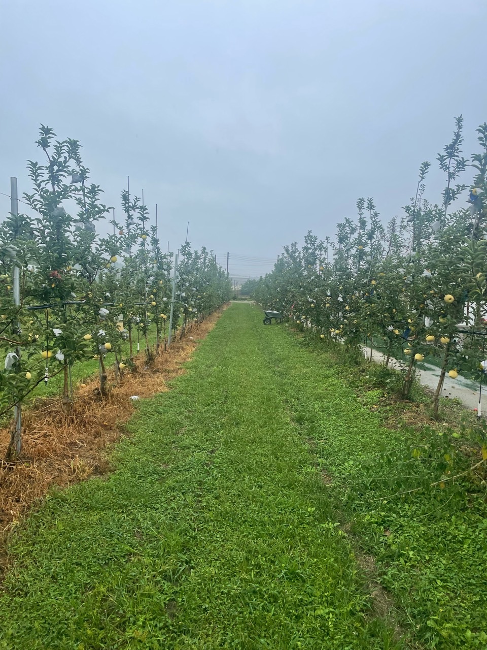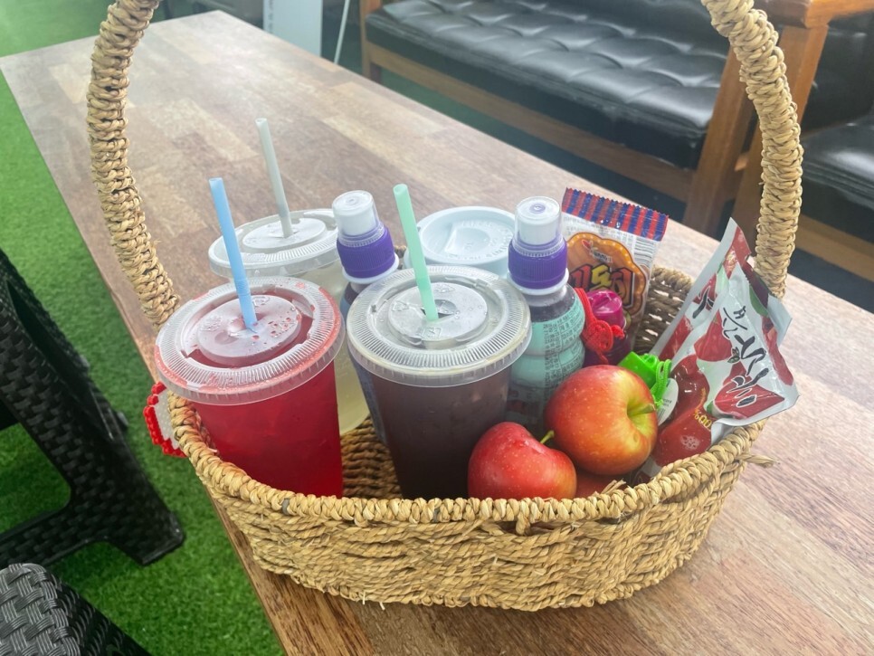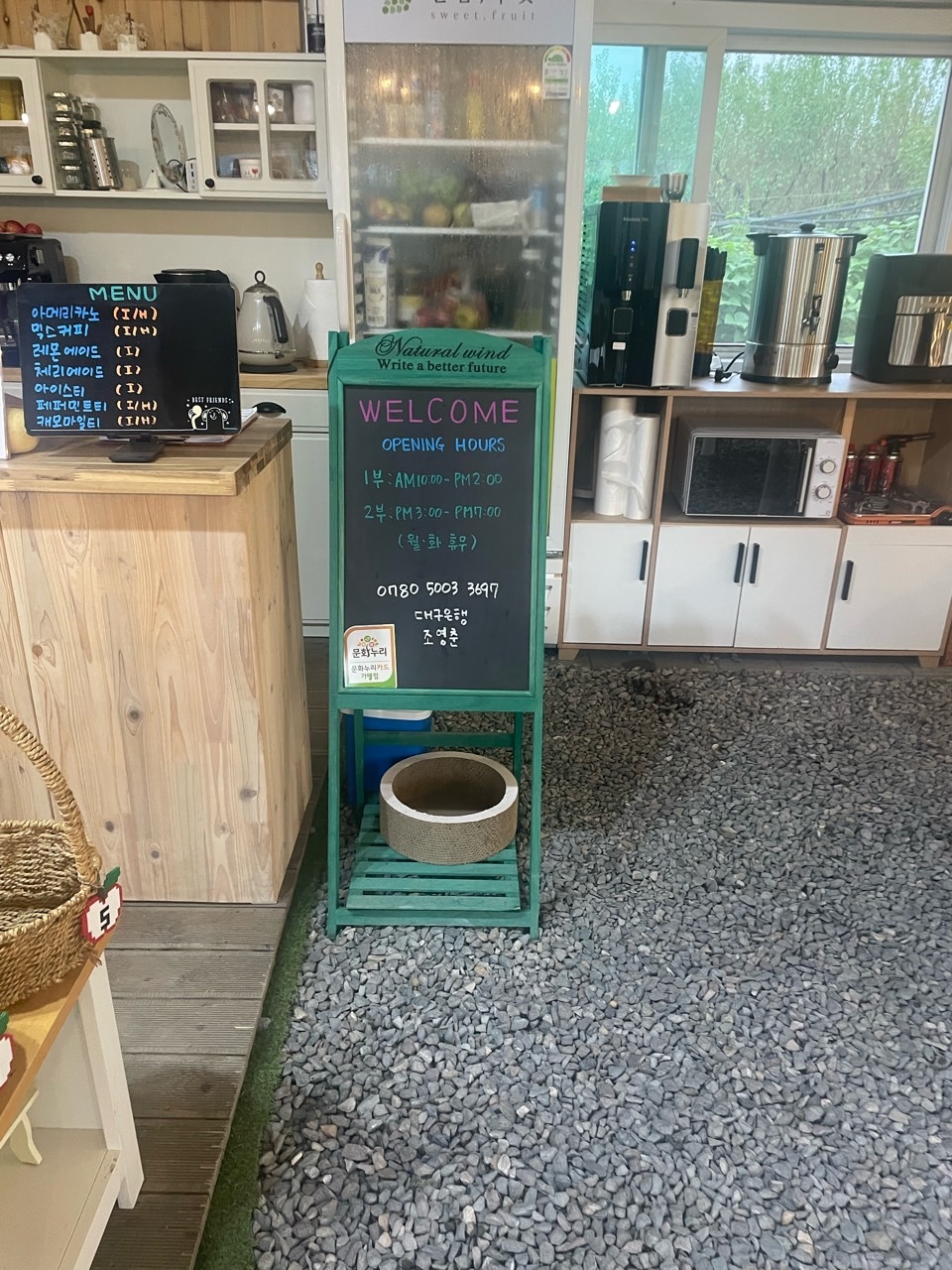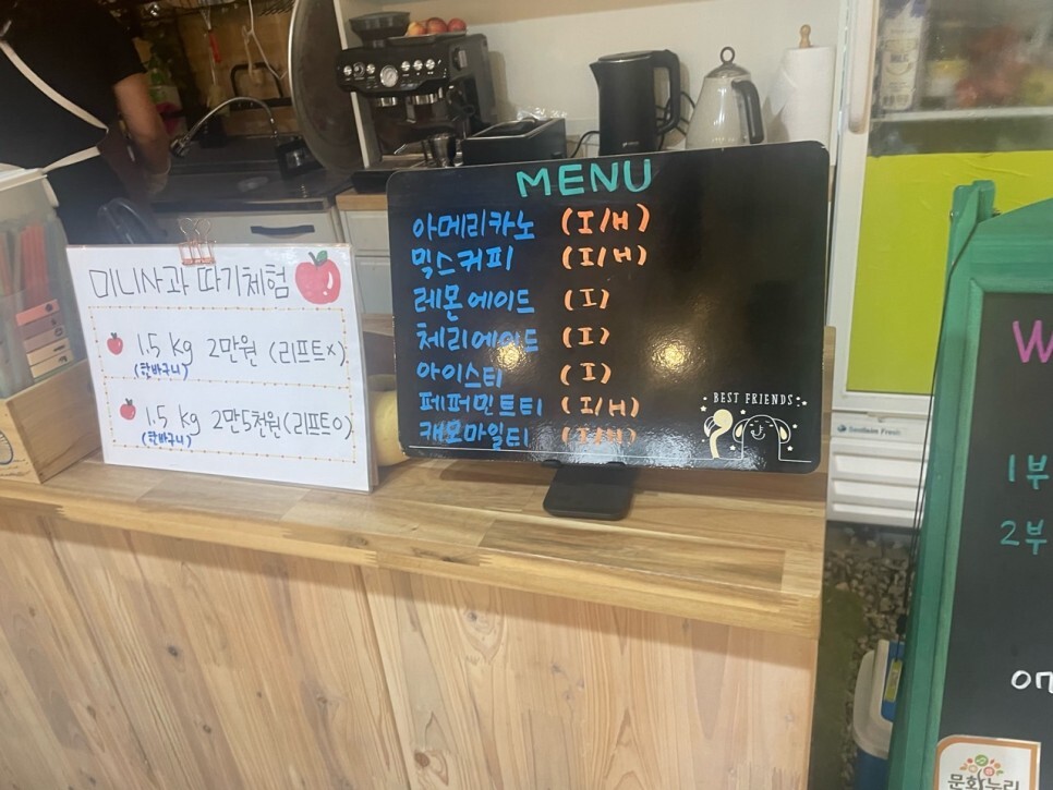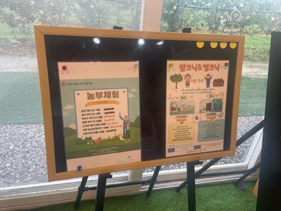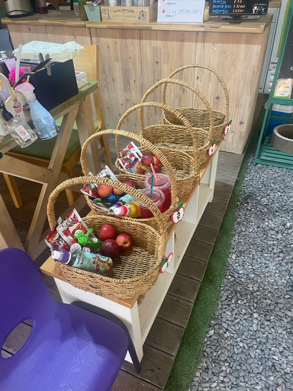 이렇게 입구로 들어가시면 체크인을 하고 음료를 선택할 수 있어요. 아이들은 아이들 음료수 하나를 선택 가능하고 어른 음료는 만들어주십니다. 도착하면 이렇게 바구니에 과일과 과자, 선택한 음료까지 해서 나중에 가져다주십니다. 여기선 과일체험이 가능하답니다. 9월엔 사과 따기 체험을 하고 있었는데 1.5kg에 2만 원, 25천 원 하고 있었어요. 리프트는 높은 곳에 타고 올라가서 과일 따기 체험을 하는 건데 저흰 하지 않았답니다. 사실 이날 비가 오락가락해서 과일 따기 체험을 할 수 있을지도 미지수였거든요.