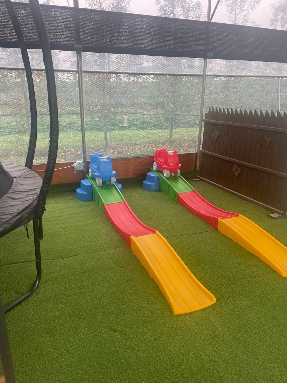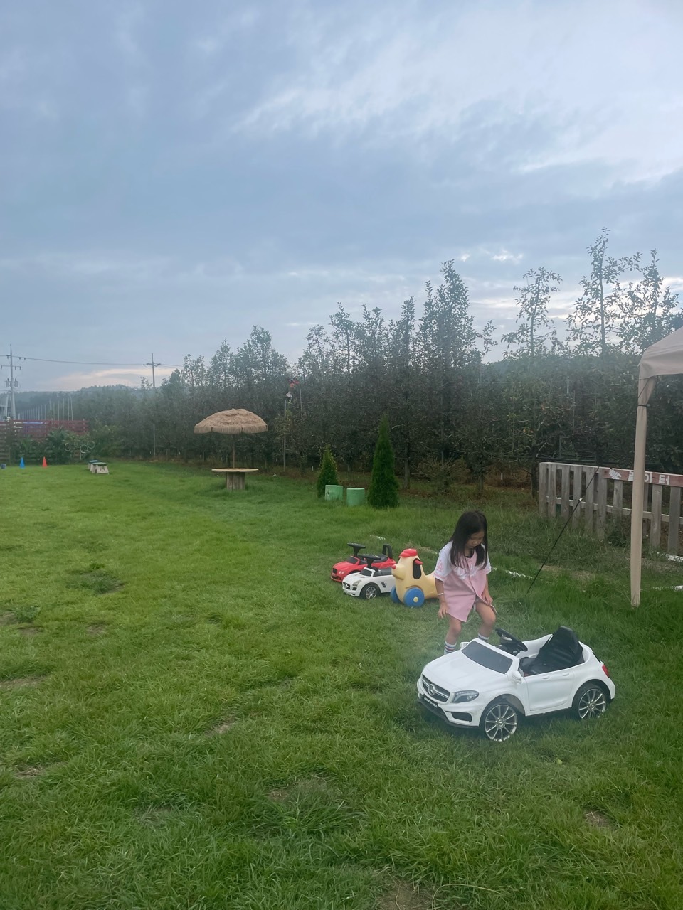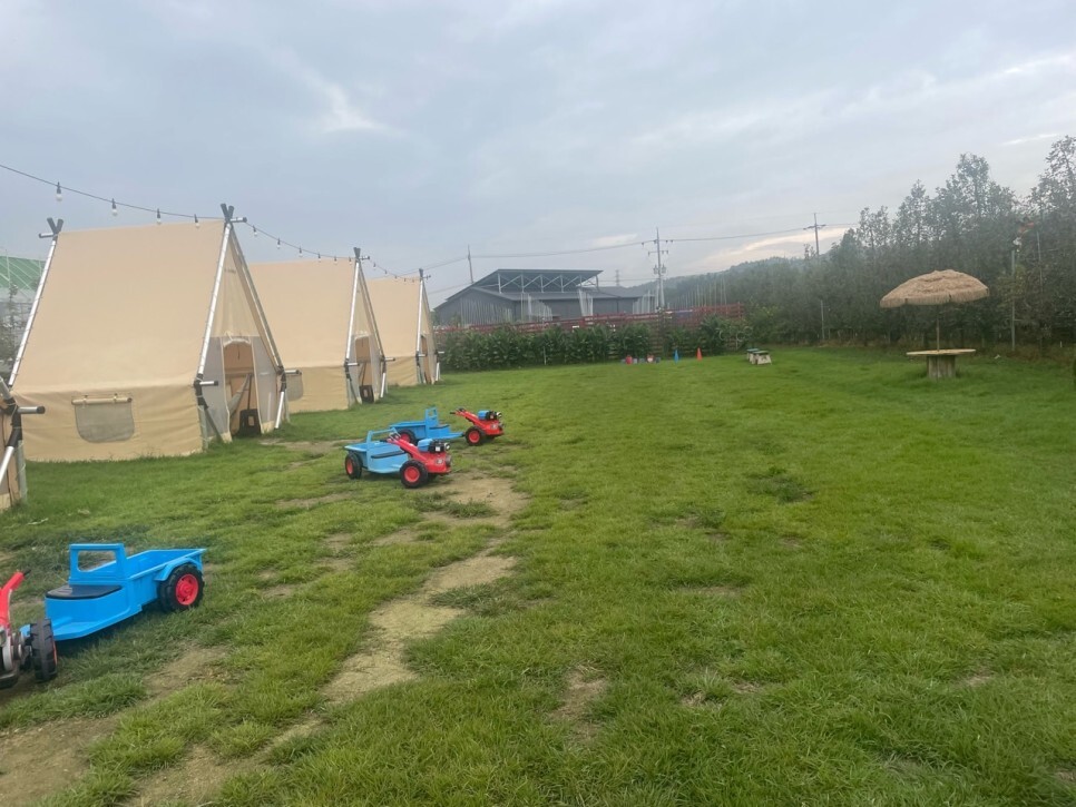 텐트 앞 야외마당은 이렇게 넓어서 아이들이 신나게 놀기 좋아요. 모래놀이와 전동 트랙터 장난감, 붕붕 하 등 아이들이 탈것이 잘돼있고 한편엔 미끄럼틀도 있어 아이들이 놀기 좋았어요. 저희가 처음에 들어올 때 준 바구니 안에는 비눗방울도 있었는데 저흰 사용하진 않았답니다.