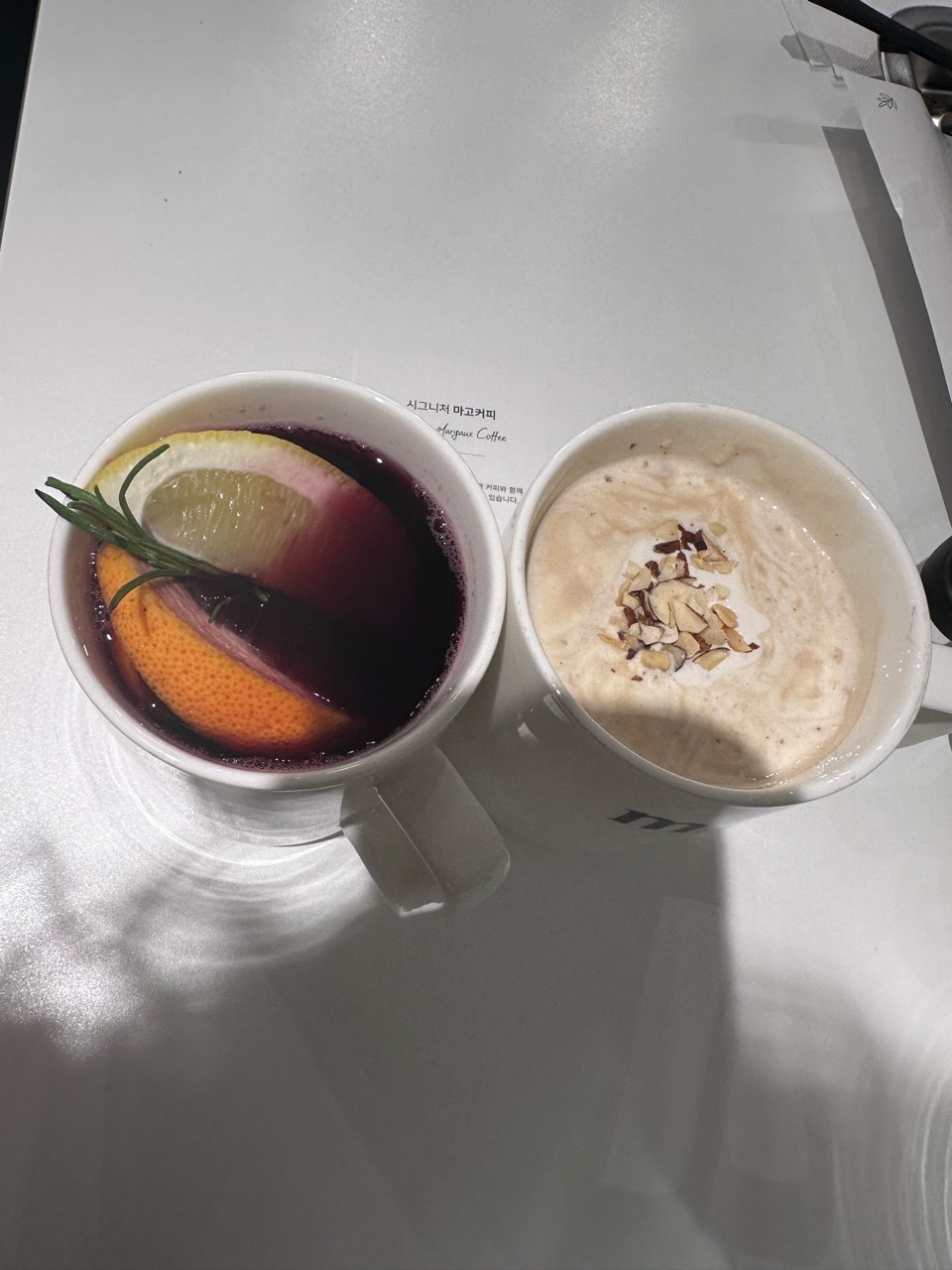저녁이라 커피는 부담스러웠고 저흰 몇 개 안 남은 나머지 빵에 자몽 꿀이, 뱅쇼, 이 카페의 시그니처인 마고 커피를 맛보기로 했어요. 자몽 꿀이 맛있고 뱅쇼 역시 진하고 맛있었어요. 시그니처 마고 커피는 오! 너무 맛있었어요. 달달한 크림과 함께 먹는 커피인데 크림이 달달하며 고소했어요. 요즘 이런 크림 커피를 각 카페마다 시그니처로 밀고 있는 데 이 집 또한 아주 맛있네요. 곡물 라테에 에스프레소 먹는 맛이긴 한데 이 곡물의 맛이 아주 크리미하고 부드럽고 맛있네요. 너무 달지도 않아 더 좋은 것 같습니다. 블랙빈 커피와 비슷한 맛이네요.