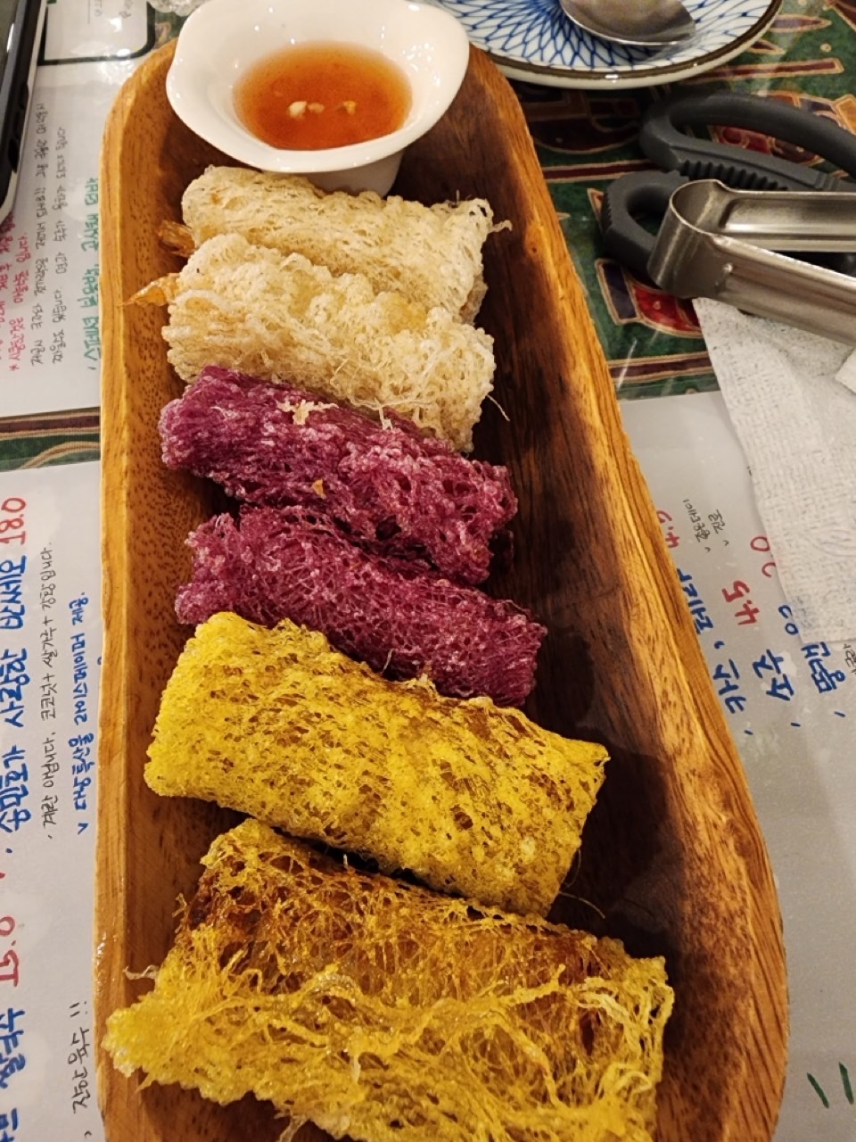 스프링롤은 처음 먹어봤어요. 베트남 식 만두라 했는데 겉은 바삭하고 속은 고기가 꽉 차 맛있었어요. 같이 곁들여 먹는 소스는 새콤달콤 하여 더 입맛을 자극해 주었답니다. 가격도 저렴한데 맛도 있어 생각보다 스프링롤을 아이들이 잘 먹었답니다. 색깔이 달라 안의 소도 다를 줄 알았는데 안의 소는 다 똑같고 겉의 피만 달랐어요. 여러 색이 있으니 훨씬 보기 좋고 맛있는 느낌입니다.