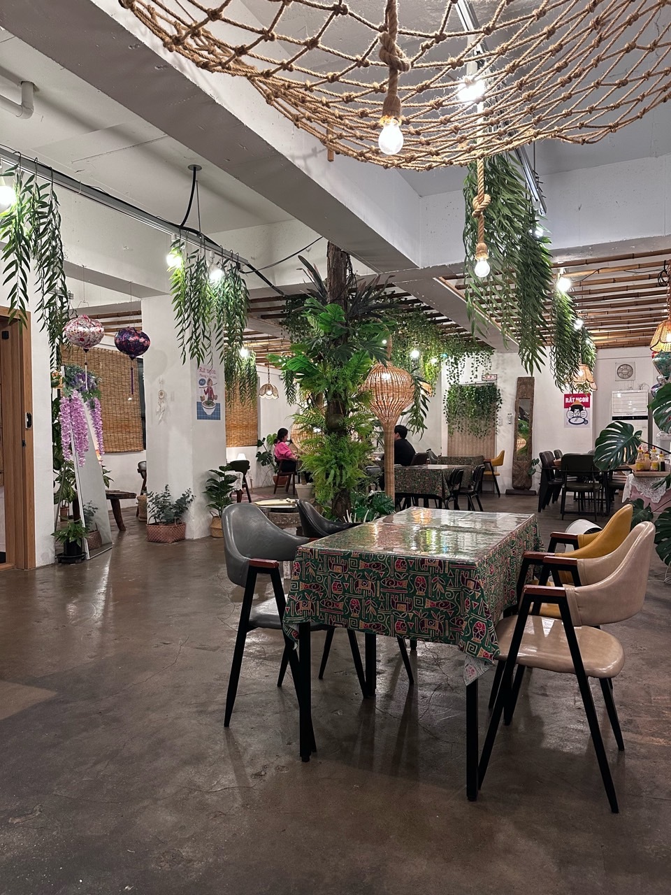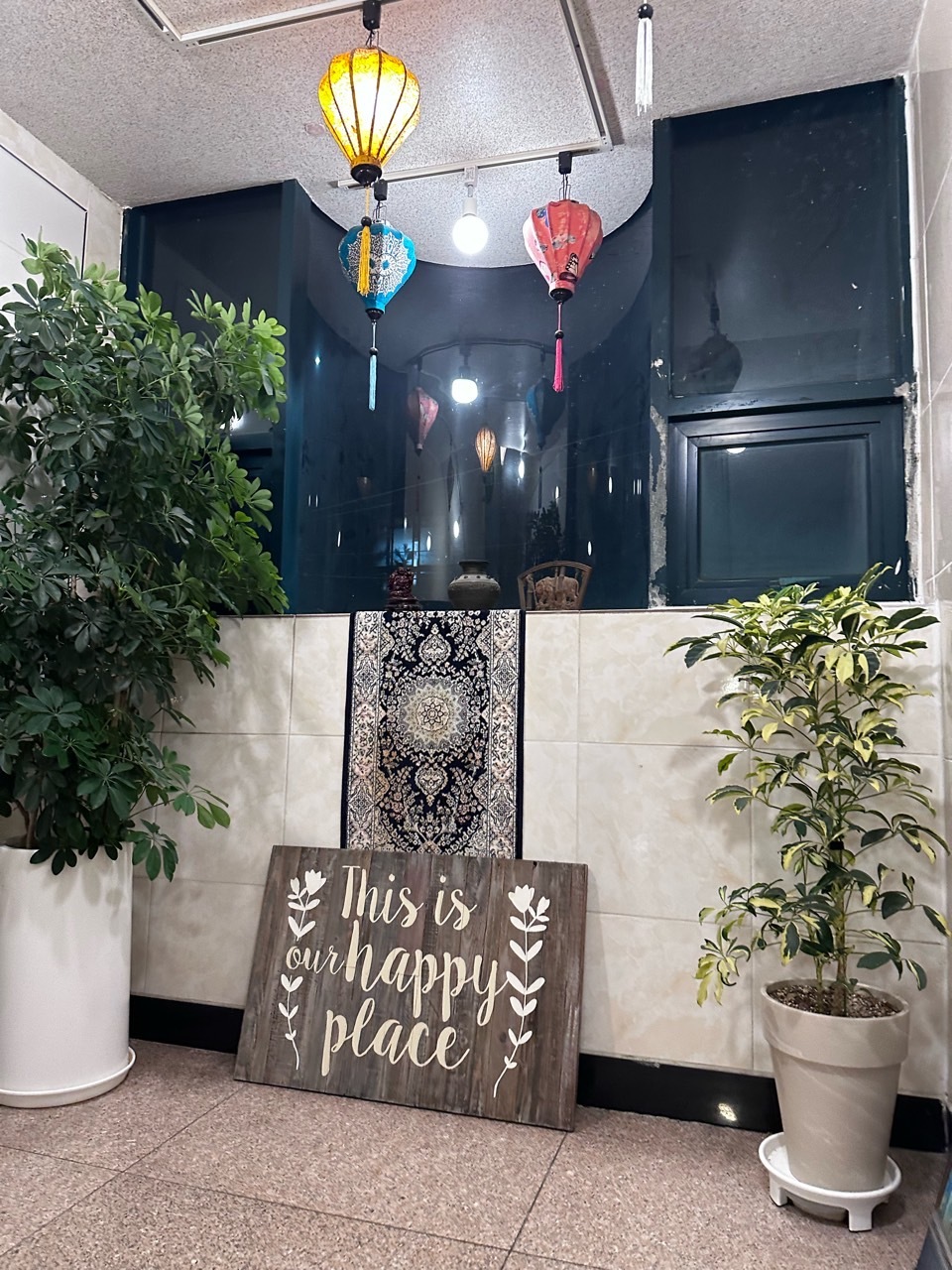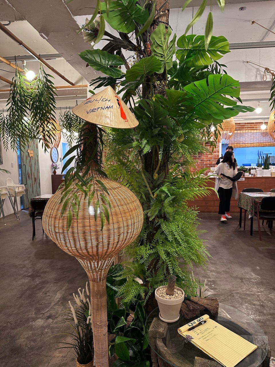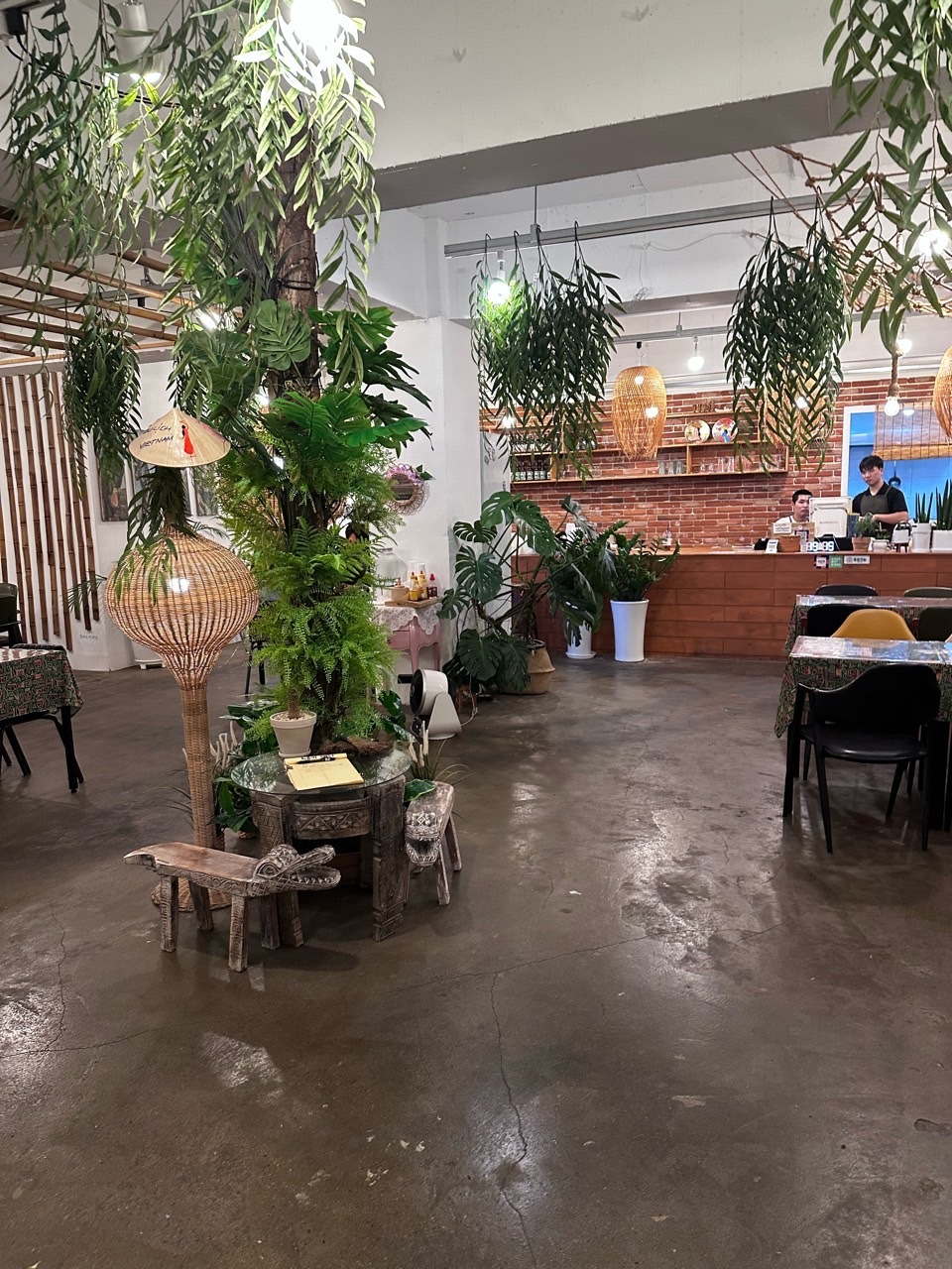 벳남구쁘는 2층에 위치해 있어요. 가게 옆에 주차장이 있으니 사용하시면 될 것 같습니다. 저흰 저녁에 먹으러 갔어요. 이런 곳에 가게가 있었나? 싶을 만큼 주택가 내부라 내심 놀랐지만 가게 안에 들어간 순간 깜짝 놀랐답니다. 푸릇푸릇 한 인테리어와 함께 생각보다 많은 분들이 식사를 하고 계셨어요. 가게 내부 곳곳에 베트남을 느낄 수 있는 소품들이 아기자기하게 있어 베트남에 온 듯한 느낌도 들었답니다. 주방과 카운터 또한 오픈 주방으로 이루어져 있어 더욱더 현지 느낌이 났어요.