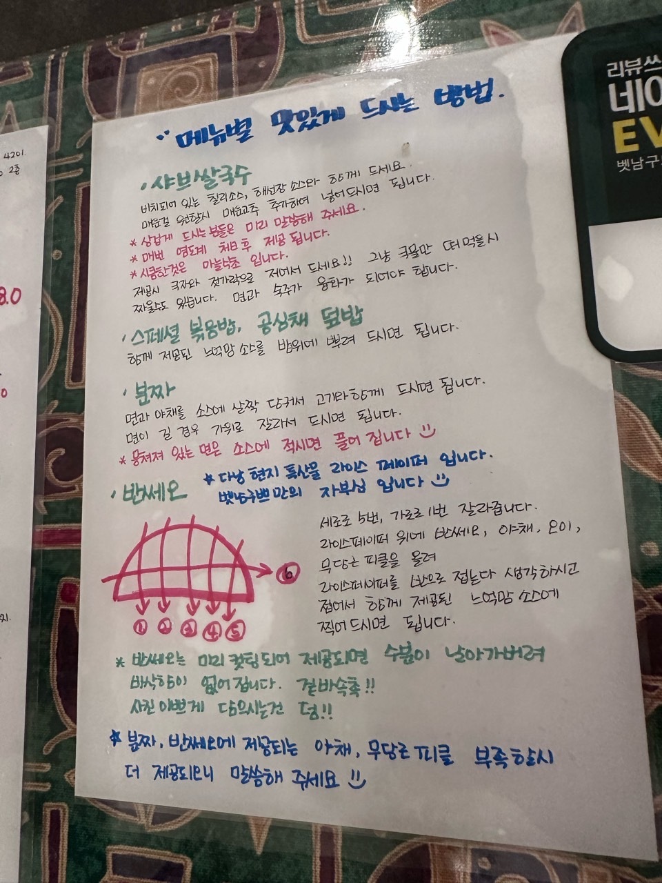 저흰 반쎄오와 쌀국수, 스프링롤, 공심채 덮밥을 먹기로 했어요. 공심채 덮밥을 왜 시키냐 했더니 이 집의 시그니처라 하더군요. 베트남 음식점은 처음이라 내심 설레기도 하고 다 같이 해외에 온 것 같기도 하고 기분이 말랑말랑하네요. 메뉴별로 맛있게 먹는 법이 테이블마다 나와있었어요. 직접 적은 글씨가 더 정성스럽게 만드는 것 같네요.