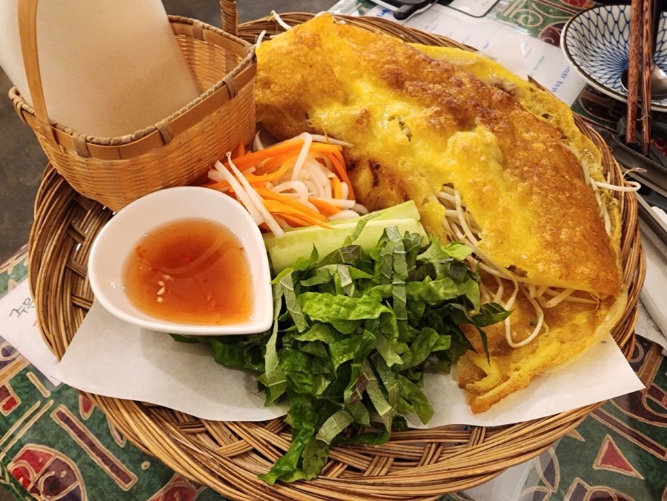 제가 제일 기대한 반쎄오입니다. 이걸 어떻게 먹나 싶을 만큼 컸어요. 달걀 피를 자르고 그 위에 라이스페이퍼를 올려 야채와 함께 곁들여 먹는 데 제가 먹을 줄 모르는 걸까요? 왜 야채들이 줄줄 빠져나가는지. 깔끔하게 먹고 싶은 데 왜 이리 질질 다 흘리고 더러운지. 제 친구는 엄청 깔끔하게 먹던데. 제가 이상한가 봐요. 이렇게 먹는 음식이 맞는 건가요?? 맛있게 먹는 법에 보니 가위로 잘라 얹어 먹으면 된다 해서 그대로 먹었는데 야채를 종류별로 다 담아 먹고 싶은데 다 흘리고 난리 나고 해서 대충대충 먹었어요. 그냥 달걀에 야채 얹어 먹는 맛이네요. 너무 기대했나 봐요. tv에선 엄청 맛있게 먹었는데 제 스타일은 아니네요. 맛은 있습니다. 그러나 반쎄오가 제가 상상한 맛은 아니었어요. 그래도 전 반쎄오를 가장 많이 먹었답니다. 달걀에 야채라니 보장된 맛이잖아요?