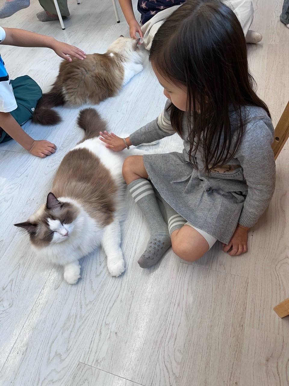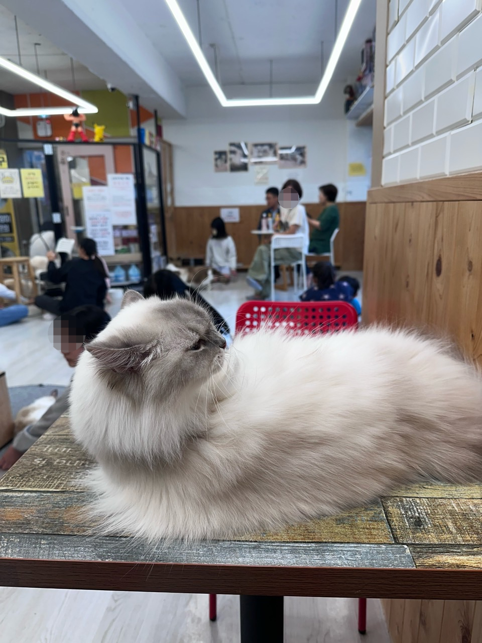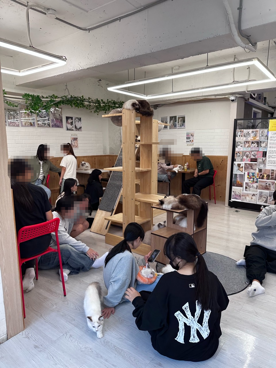 안에는 많은 고양이들이 있었고 꼬리를 살랑살랑 흔들며 아이들과 즐겁게 노는 모습이었어요. 입장료 안에 음료가 포함인데 음료는 냉장고 안에서 제품으로 된 음료수 하나를 들고 들어갈 수 있어요. 안엔 테이블이 많이 없어 의자에 앉을 순 없지만 바닥에 앉아있으니 고양이들이 더 많이 다가오더군요! 손님들은 대부분 초, 중학생들이었고 저처럼 보호자로 따라온 어른 몇 명과 연인으로 보이는 커플 2~3팀 정도였답니다.