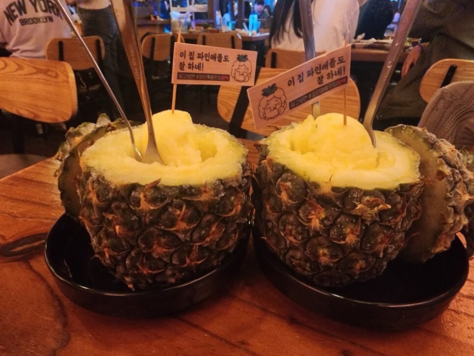 마찬가지 저의 최애 메뉴입니다. 요즘 술집에 살얼음 파인애플이 많이 보이는 데 그래도 여기가 제일 저렴해요. 한통 가지곤 모자라요. 1인 1 통해야 합니다. 술 마시면 아이스크림 당기잖아요? 이걸 먹으면 딱 좋아요. 시원하고 달콤하고. 여름, 겨울 할 것 없이 이 메뉴는 최애 메뉴, 베스트 메뉴에요.