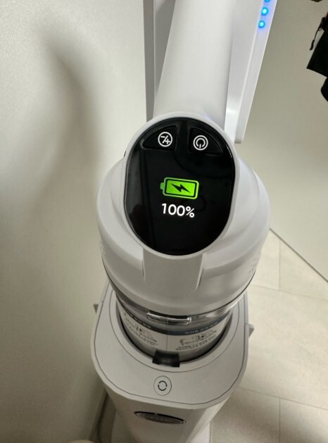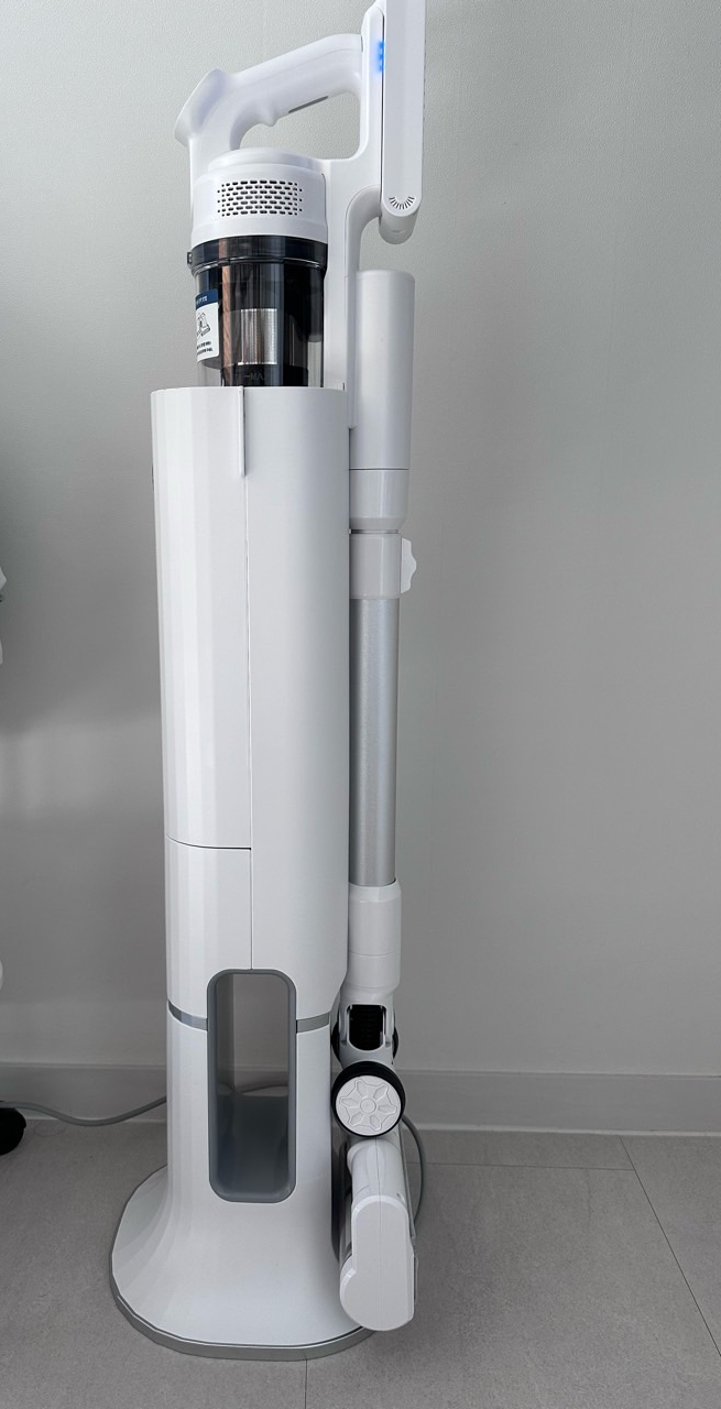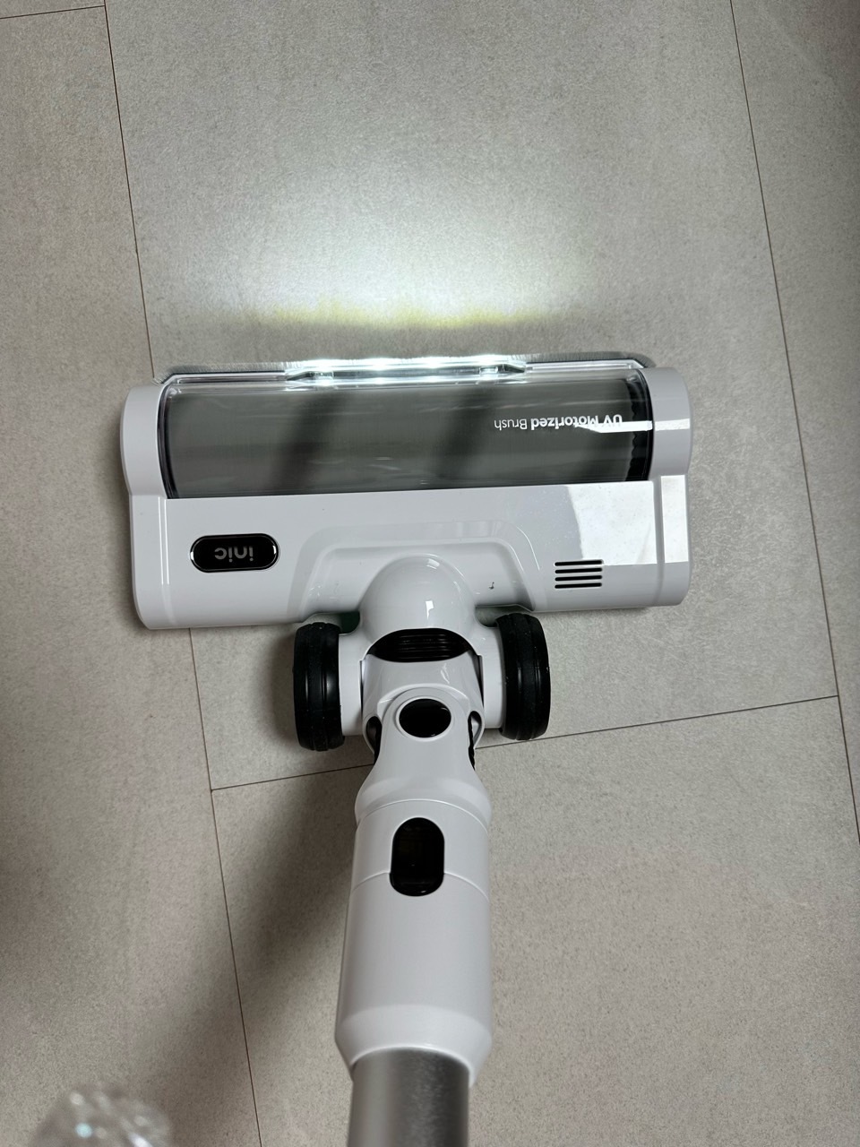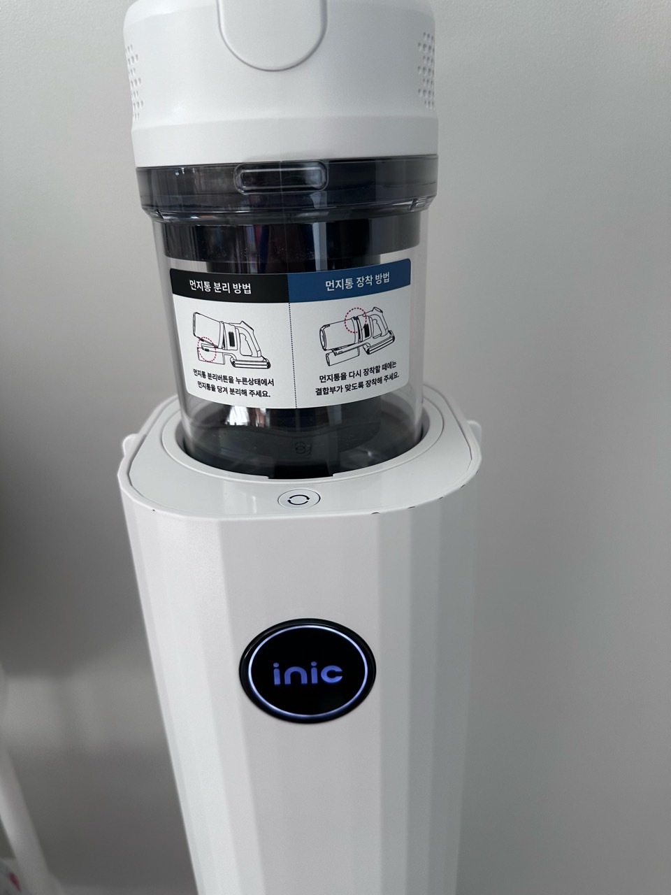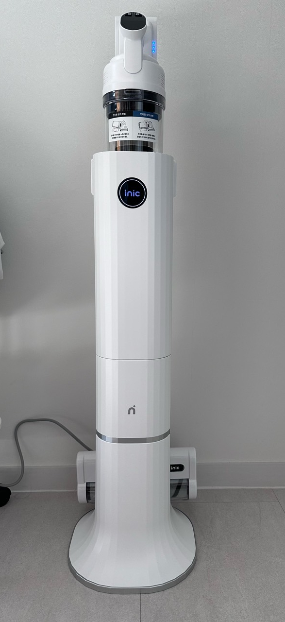 너무 깔끔하게 생겼죠? 흰색이라 요즘 집안 트렌드와도 잘 어울려 더욱 좋은 것 같습니다. 충전을 켜 두니 파란 불빛이 이쁘게 들어오는 저 INIC 마크도 너무 이쁜 것 같아 보여요. 거치대에서 먼지 비움과 충전, 보관까지 한꺼번에 이용할 수 있어요. 그래서 더욱 깔끔한 것 같습니다. 다른 청소 툴도 같이 둘 순 없습니다만 전 이게 더 좋은 것 같아요. 청소툴은 자주 사용하는 건 아니잖아요. 딱 쓰는 것만 밖에 이렇게 이쁘게 두니 더 괜찮은 것 같습니다.
