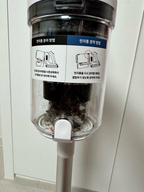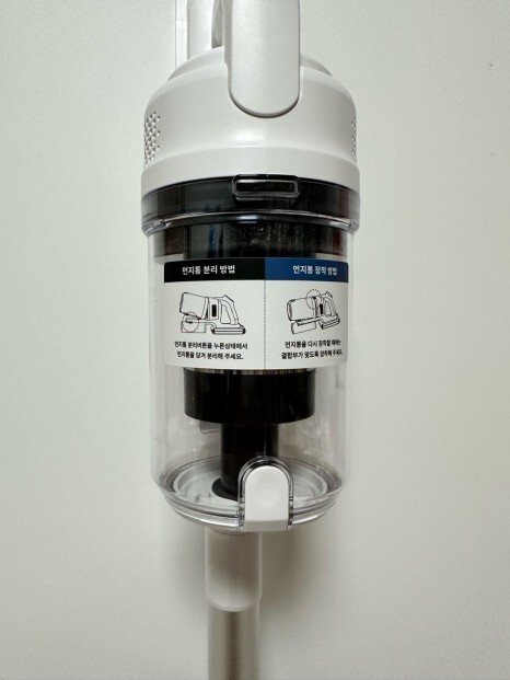 앞의 버튼을 누르게 되면 먼지통이 안에서 분리되면서 깔끔하게 먼지가 비워집니다. 그러면 아래의 파우치에 먼지가 담기게 됩니다. 눈으로도 바로 확인 가능하고 다 차면 그대로 버리고 새걸 끼우면 되니 먼지 마실 위험도 훨씬 적고 깔끔한 것 같네요. 그리고 먼지통이 투명으로 되어 있어 먼지가 차는 게 실시간으로 눈으로 확인할 수 있으니 먼지통이 꽉 차도 비우지 않는 사태는 벌어지지 않을 것 같네요. 설명서에 따르면 파우치는 보통 한 달 주기로 갈아주면 된다고 합니다만 가득 차면 버리면 되겠죠?