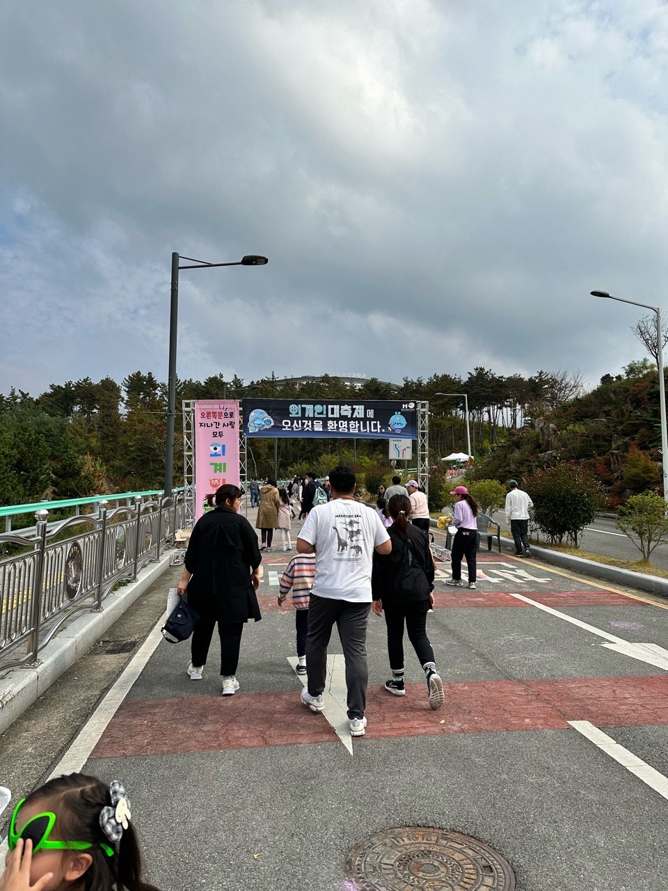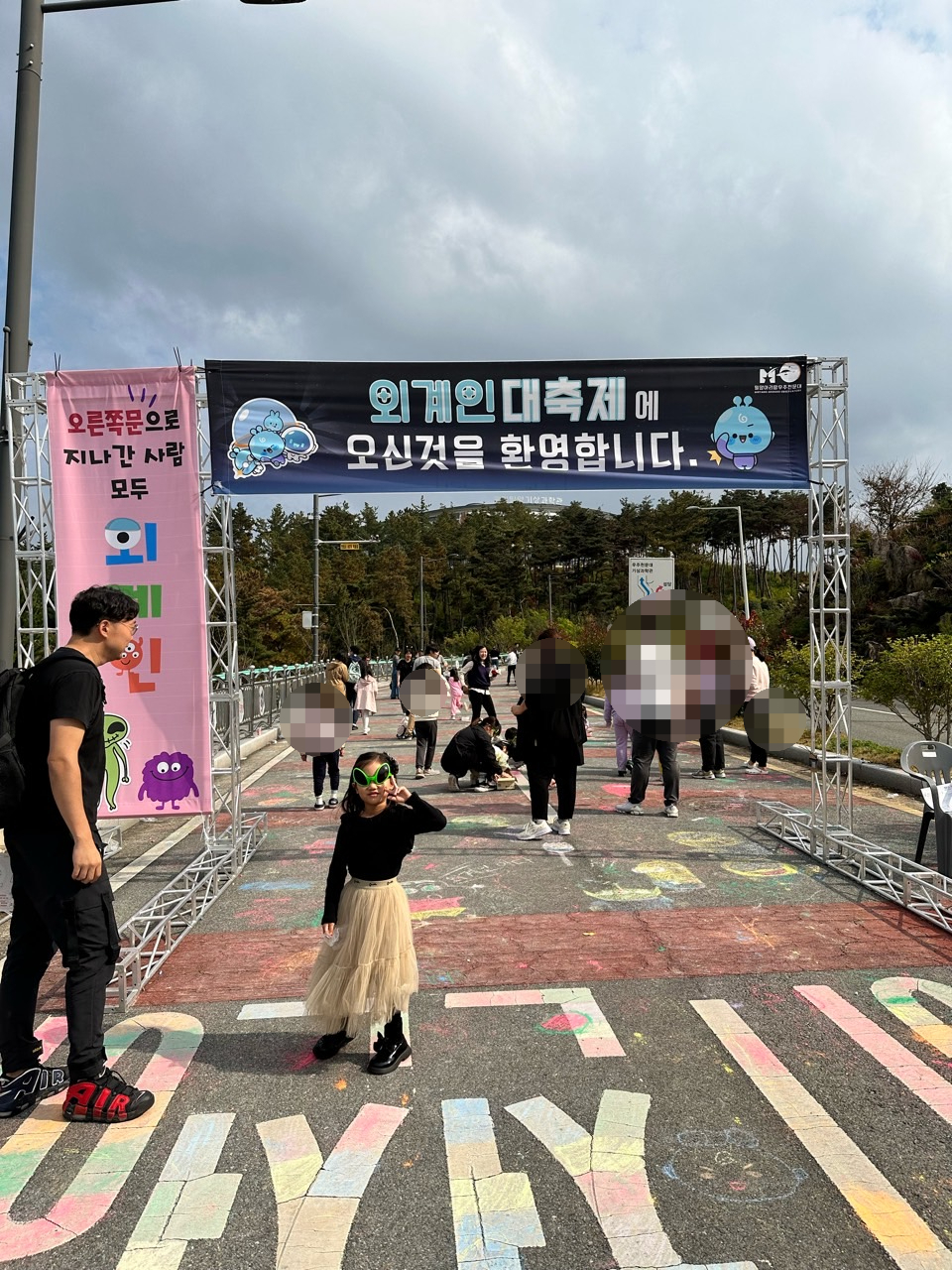 입구 안내 데스크에서 사전예약 사은품으로 안경을 받고 위로 올라가셔야 합니다. 조금 걸어 올라가시면 금방 도착해요. 가는 길 도로에 아이들이 낙서를 할 수 있도록 분필이 있어 덕분에 지루하지 않았어요.