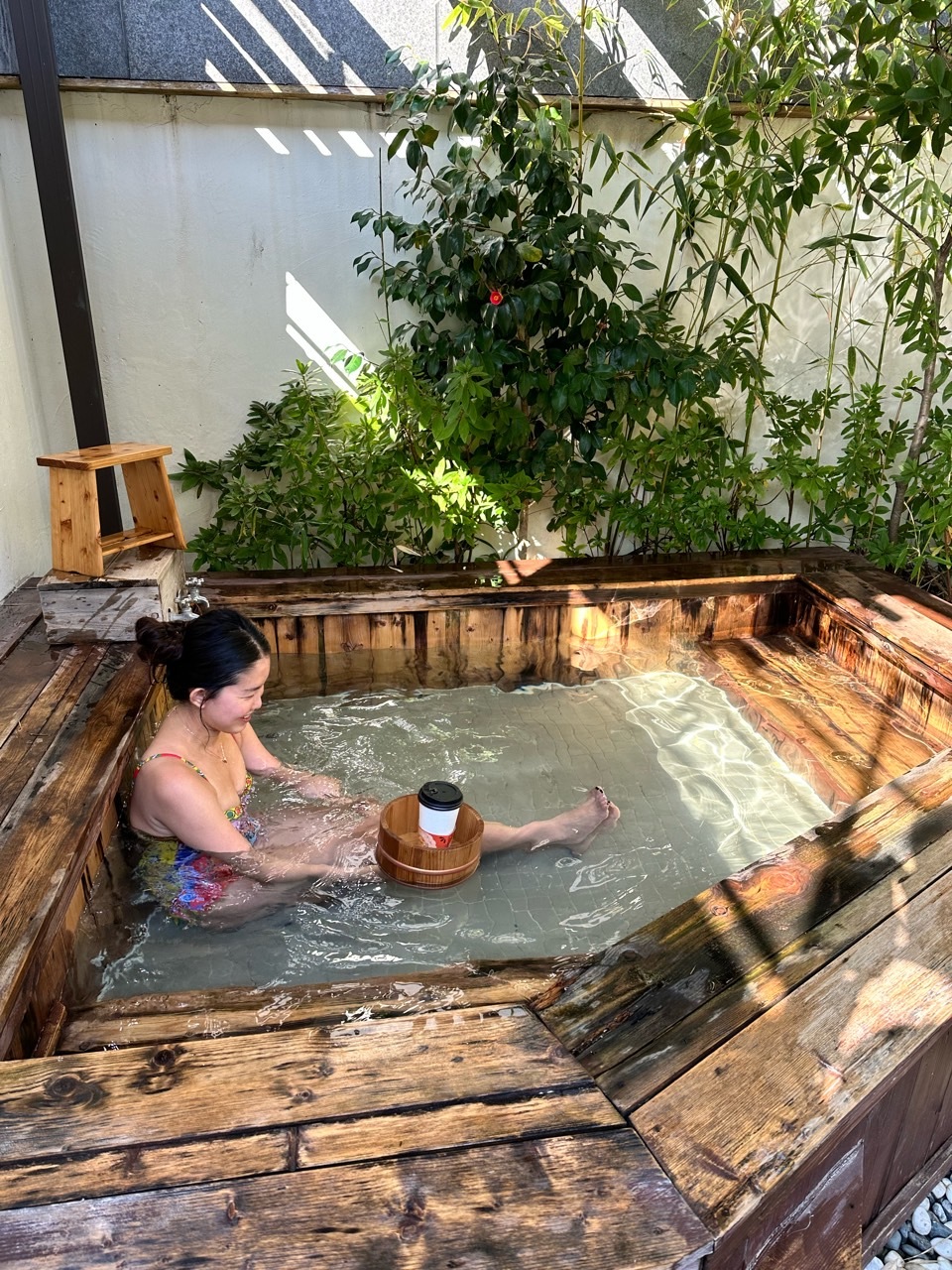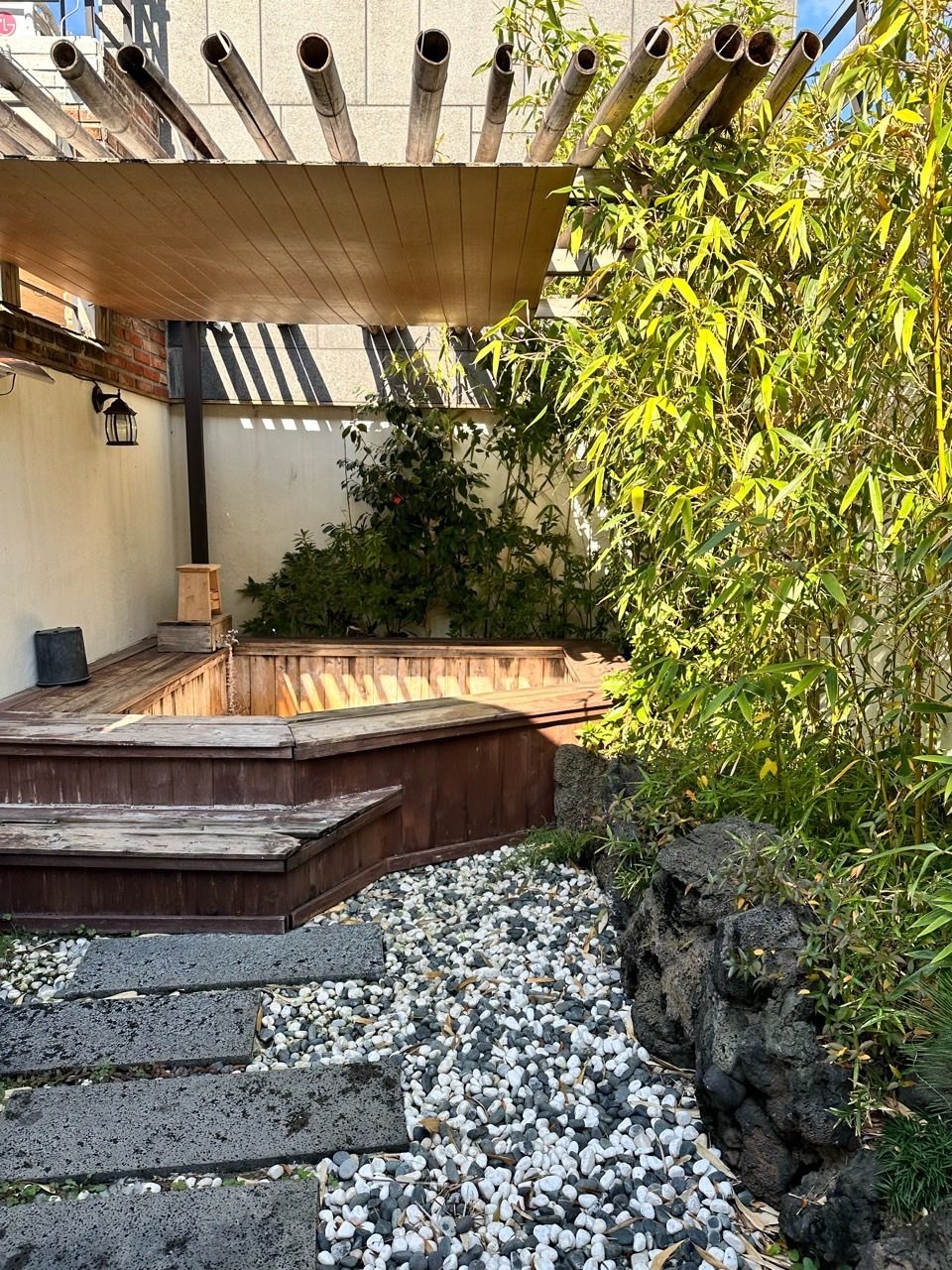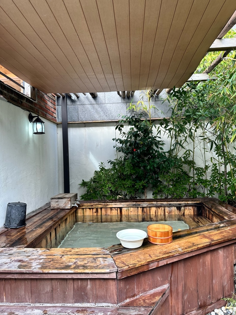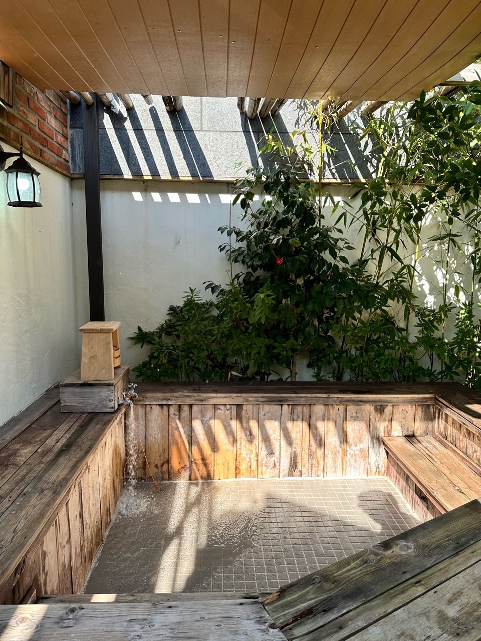 드디어 노천탕입니다. 제 생각보다는 조금 작았지만 놀기엔 전혀 무리 없어 보입니다. 히노끼탕이라 그런지 더 감성적이에요. 이렇게 대실은 낮에만 이용 가능하지만 숙박은 저녁 6시부터 다음날 12시까지 이용 가능합니다. 밤에 별 보며 온천 하면 정말 힐링이 따로 없겠어요. 이렇게 지붕도 있어서 비가 와도 문제없어 보입니다. 대나무 숲 사이로 노천탕이 있어 더 운치 있어 보이고 주변에 높은 건물도 없어 그냥 해도 무방할 것 같아요. 저 멀리 아파트가 보이긴 하는 데 설마 여기까지 보겠어요? 도착하자마 물을 받기 시작해서 2/3 받기까지 딱 30분 걸렸어요. 온천수라 그런지 뜨거운 물만 틀어도 그렇게 데일 것 같은 뜨거움은 아니었어요. 그래서 저흰 찬물은 하나도 틀지 않았답니다.