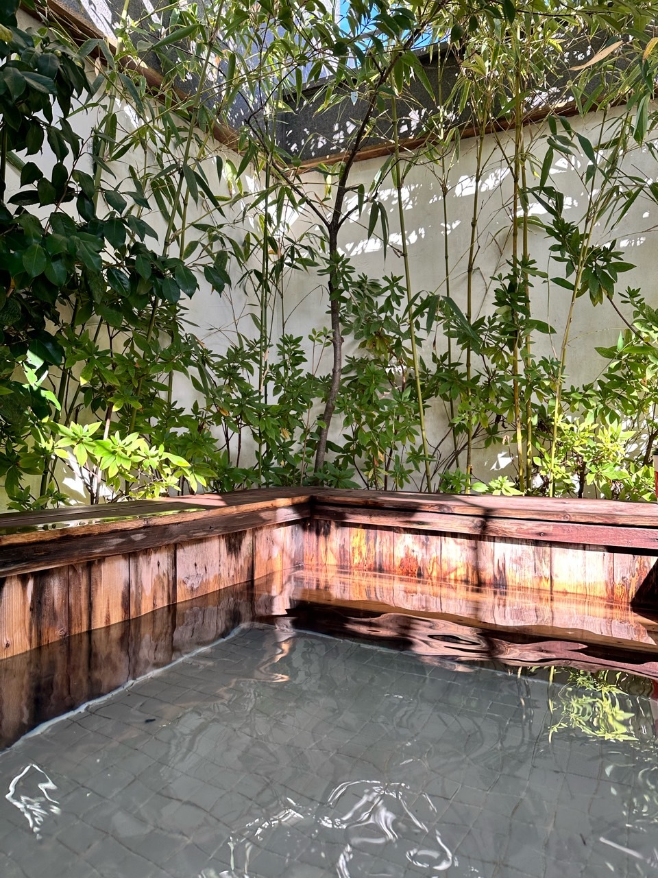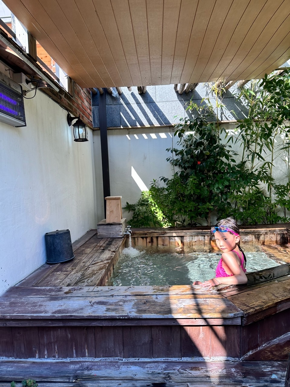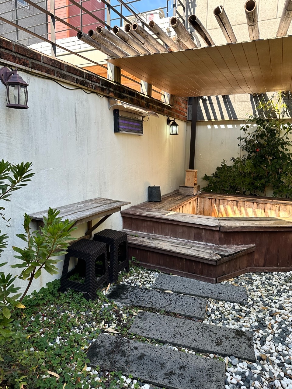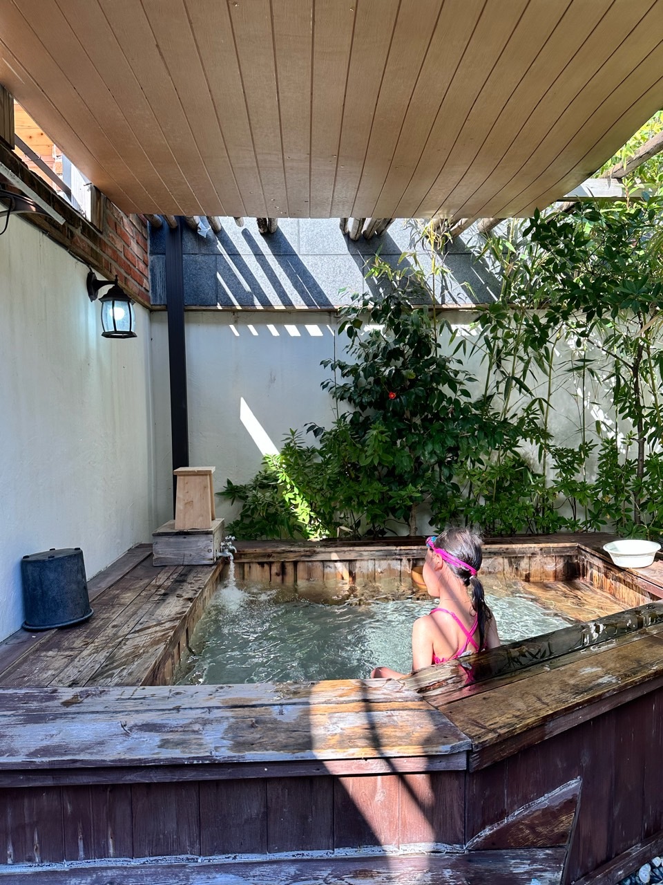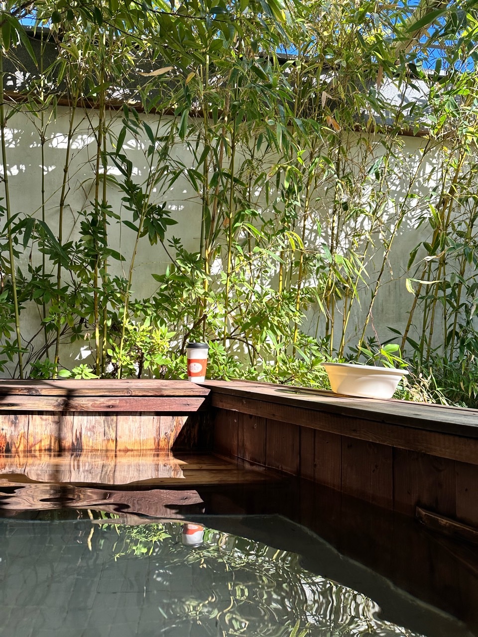 드디어 노천탕입니다. 제 생각보다는 조금 작았지만 놀기엔 전혀 무리 없어 보입니다. 히노끼탕이라 그런지 더 감성적이에요. 이렇게 대실은 낮에만 이용 가능하지만 숙박은 저녁 6시부터 다음날 12시까지 이용 가능합니다. 밤에 별 보며 온천 하면 정말 힐링이 따로 없겠어요. 이렇게 지붕도 있어서 비가 와도 문제없어 보입니다. 대나무 숲 사이로 노천탕이 있어 더 운치 있어 보이고 주변에 높은 건물도 없어 그냥 해도 무방할 것 같아요. 저 멀리 아파트가 보이긴 하는 데 설마 여기까지 보겠어요? 도착하자마 물을 받기 시작해서 2/3 받기까지 딱 30분 걸렸어요. 온천수라 그런지 뜨거운 물만 틀어도 그렇게 데일 것 같은 뜨거움은 아니었어요. 그래서 저흰 찬물은 하나도 틀지 않았답니다.