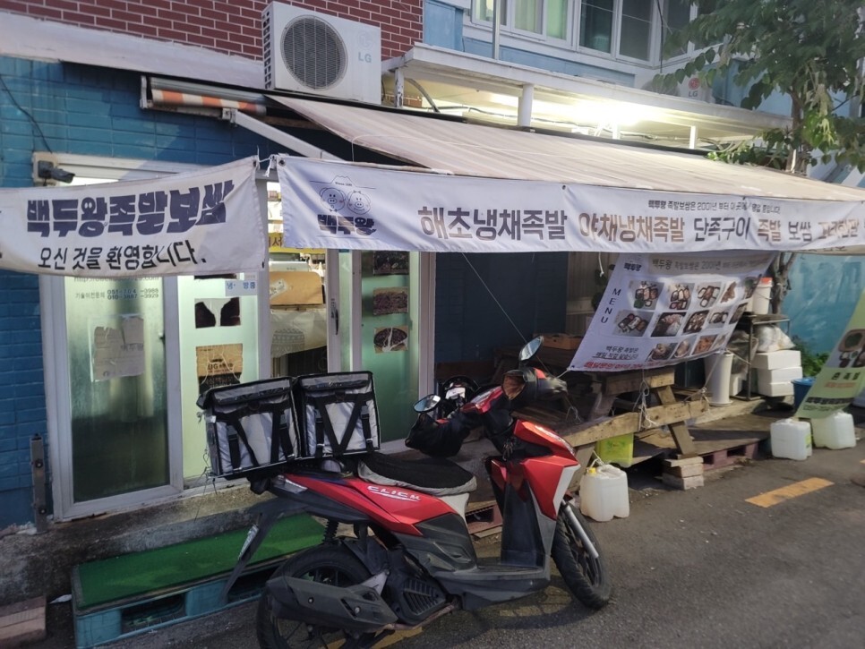 백두왕족발보쌈은 2001년부터 장사하던 곳입니다. 어느덧 23년째 이 자리에서 영업하고 있네요. 가게라고 해서 거창한 건 없습니다. 간판도 없어요. 플래카드가 있습니다. 가정집을 개조해서 장사하시는 듯했습니다. 그래서 매장은 매우 협소해요. 테이블 4개 정도? 방으로 쓰던 곳 같은 데 그곳에 테이블을 두고 장사하십니다. 요즘 보기 힘든 정말 노포입니다. 그리고 안 찾을 수 없는 것이 그 근처에 가면 족발 냄새가 엄청나요. 항상 오전, 오후에 내내 족발을 삶고 계십니다. 이 족발집은 매일매일 사장님이 직접 삶으세요. 그리고 전화를 안 하고 가면 간혹 족발이 다 팔리고 없을 수 있어요. 그러면 다음 족발이 나올 때까지 시간이 걸리기 때문에 꼭 전화 주세요. 주로 배달, 포장 전문이긴 하지만 홀에서도 드실 수 있어요. 그 근처 배달은 배달료를 따로 받지 않는 다 합니다. 해운대구 좌동까지는 배달이 되는 듯했어요. 저희 집까지는 배달이 되지 않아 저희는 늘 포장해서 먹고 있어요.