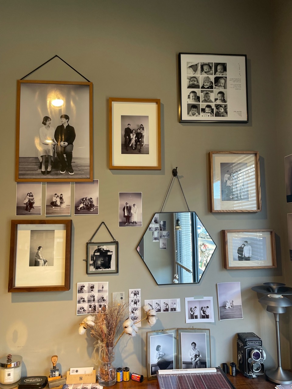 이렇게 한쪽벽에 가득한 흑백사진입니다. 너무 예쁘죠? 다음에 저희 가족도 찍으러 오려고요. 저흰 매년 가족사진을 찍습니다. 주로 송정에 위치한 사진관에서 찍었는데