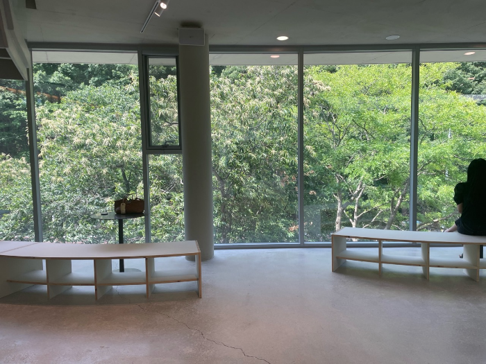 전면 창으로 보이는 초록초록뷰 좀 보세요. 바로 아래는 계곡이 흐르고 있어서 너무 좋습니다. 이렇게 뷰를 바라보게 테이블이 세팅되어 있답니다. 넓은 공간 안에 생각보다 테이블 수가 적어서 사람이 많다는 느낌은 전혀 안들고요. 그렇게 떠들썩한 분위기도 아닙니다. 창밖을 바라보며 멍때려도 좋을 것 같고 아무 생각없이 커피 마시며 책을 읽어도 좋을 것 같아요.