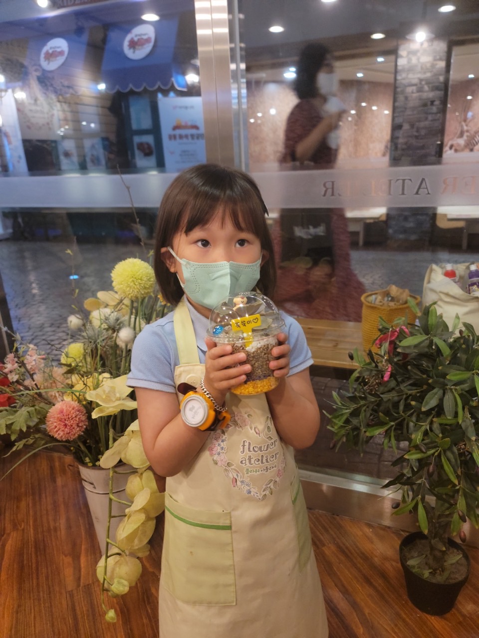 플라워 아뜰리에입니다. 원하는 식물을 하나 선택 한 다음 예쁜 모래를 담고 분갈이를 해 주네요. 식물은 집에 들고 가요. 볼 때마다 아주아주 좋아합니다. 본인이 골랐다고요ㅎㅎㅎ. 여러가지 모래를 색깔별로 예쁘게 담고 본인이 골라온 식물을 넣고 예쁘게 꾸며 컵에 넣어주네요. 이 체험이 시간이 제일 많이 걸렸던 것 같아요. 선생님은 한 명이고 봐줄 애들은 8명인데 은근히 아이들 별로 손이 많이 가는 것 같아요. 선생님이 가장 바빠 보였답니다.