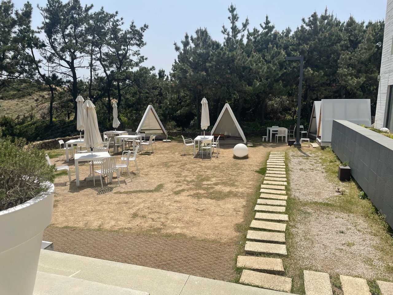 야외로 나가 볼게요. 야외는 계단식으로 되어 있어 뷰가 너무너무 잘 보여요. 바로 앞은 바다라 바람도 시원하게 잘 불고 분위기도 아주 좋네요. 한켠에 담요도 비치되어 있어 추우면 가져가셔도 괜찮을 것 같습니다. 계단 옆으로 가든이 보여요. 오두막 같은 예쁜 집과 테이블이 보이네요. 오두막 안쪽엔 매트와 테이블이 있어서 누워도 될 것 같네요. 그렇지만 오두막에 있으면 바다가 보이지 않겠죠? 손님이 많이 없다면 가든에서 아이들이 놀아도 좋을 것 같아요. 가볍게 소풍 온 것처럼 말이에요. 이렇게 테이블이 많은데도 주말엔 자리가 없으니 인기 많은 곳엔 이유가 있겠죠??