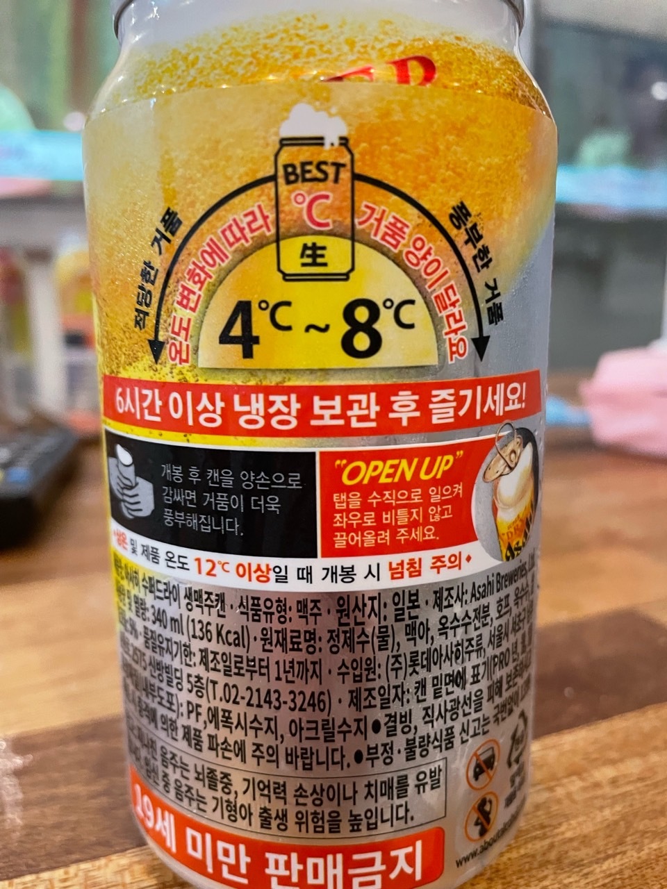 캔의 뒷면에 따는 방법과 어떻게 하면 거품이 더 풍성하게 나는 지 적혀 있답니다. 뚜껑을 따고 양손으로 누르지 않고 잡고만 있어도 거품이 보그르르 올라옵니다. 안의 내부의 온도차로 거품이 올라오는 것 같네요. 맥주가 젤 맛있는 온도가 4~8도라고 적혀 있답니다. 보통 냉장고 온도가 3도 또는 4도이므로 손으로 감싸면 온도가 올라가서 거품이 풍성하게 일어나는 것 같네요.