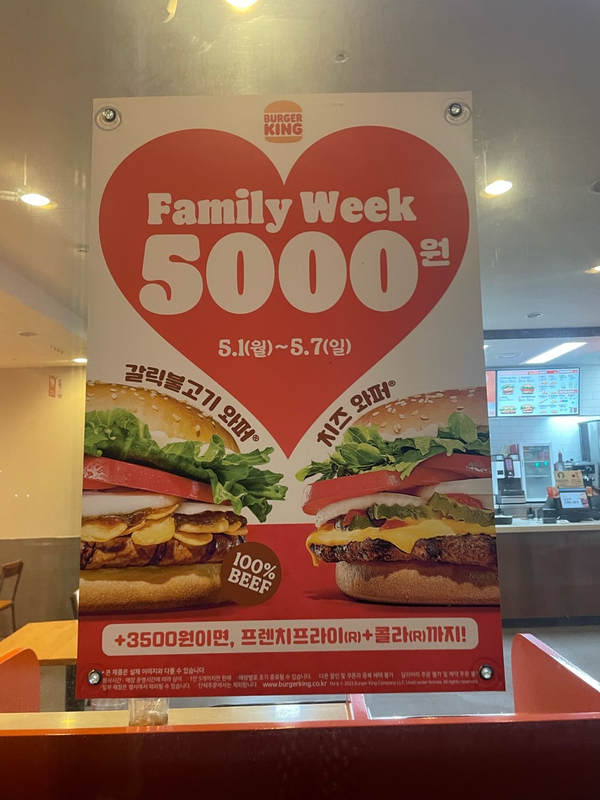 갈릭불고기와퍼와 치즈와퍼가 5000원에 즐길수 있어요! 기간은 5월 1일부터 7일까지입니다. 이번주 까지니 서둘러야겠어요.3500원 추가하면 감튀와 콜라까지 해서 세트를 8500원에 즐길수 있네요.