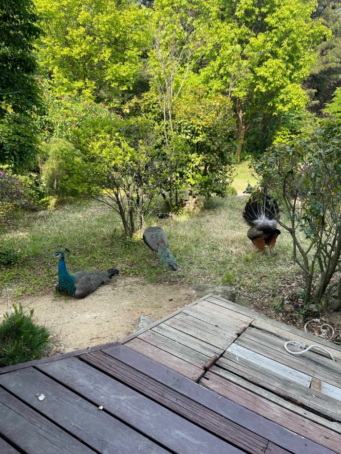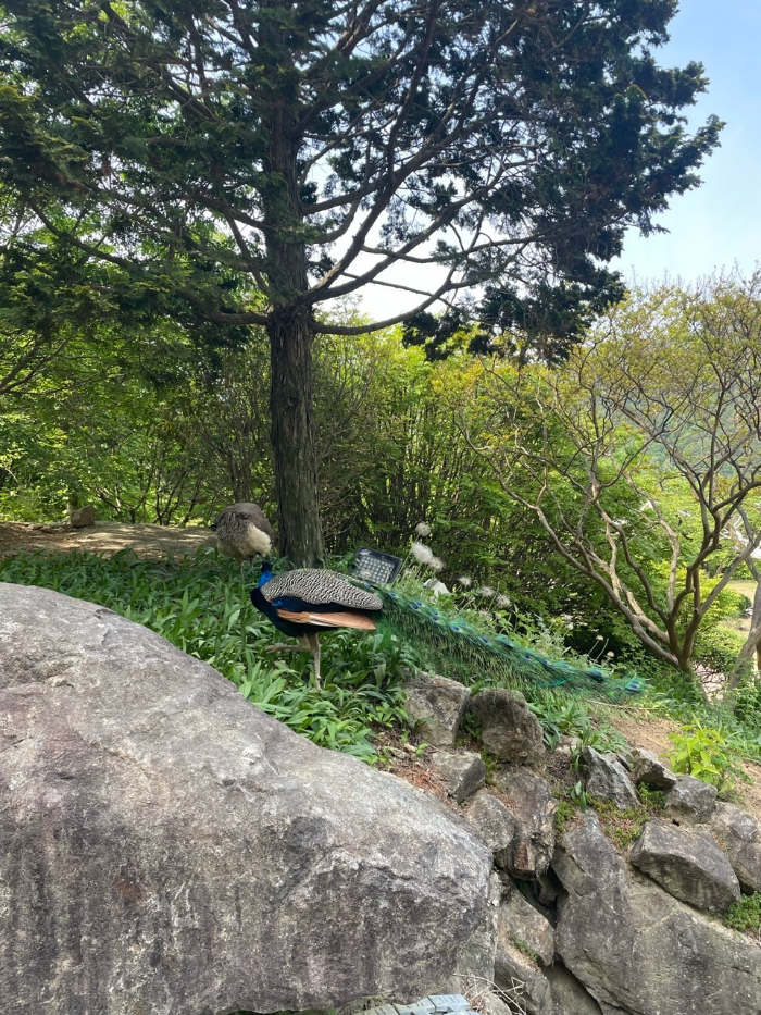 이렇게 다양한 동물들과 교감을 할 수 있는 데 제가 여기서 가장 놀란 것이 있어요. 바로 공작새였답니다. 처음에 저는 공작새를 발견 한 곳이 카페였어요. 야외카페에서 도시락과 함께 밥을 먹고 있는 데 공작새(암컷)가 유유히 지나가지 않겠어요?? 저랑 딸은 너무 놀라서 사육장에서 탈출했나 보다. 어떡하냐. 얼른 직원들에게 얘기해야겠다. 이러고 있는 데 물어보니 공작새들을 풀어놨대요. 이곳 네이처파크를 다니다 보면 심심치 않게 발견할 수 있어요. 나중엔 무덤덤히 보는 저의 모습을 발견했답니다. 암컷, 수컷 할 것 없이 자유롭게 공원을 다니고 잔디를 뜯어먹어요. 상추를 먹는 데서 상추를 줘 봤는 데 공원을 다니면서 자유롭게 식사해서 그런지 제가 주는 건 먹지 않았어요. 여기서 제일 많이 찍은 것이 공작새 같네요.