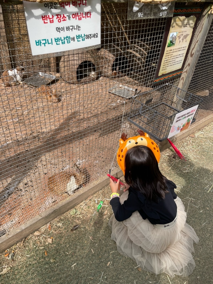 그리고 네이처파크는 다양한 먹이 주기 체험을 할 수 있어요. 처음 입구에서 산 교감세트로 초식동물들에게 먹이를 줄 수도 있고 제가 갔을 땐 안했지만 사자, 호랑이, 표범에게도 먹이주기 체험을 할 수 있었어요. 케이지 구멍 안에 쏙 넣어주게 되어있었답니다. 또 다른 먹이도 따로 판매를 하였어요. '밀웜'을 판매하며 미어캣들에게 먹이를 주는 체험도 하였어요. 사육장마다 먹이를 줄 수 있는 집게가 있어 그 도구를 이용해 주시면 돼요. 밀웜은 2000원에 판매하고 있었고 무인이었답니다. 밀웜이라뇨. 으윽. 그런데 딸은 좋아했어요. 이런 경험은 처음이잖아요. 항상 당근, 상추는 많이 주지만 벌레는 또 처음이네요. 처음이지만 의연하게 먹이 주기를 하였어요. 유료인 줄 모르고 자꾸 하고 싶다 해서 당황했네요. 또 놀란 것이 있는 데 미어캣 사육장이 아주 아주 커요. 보니 또 전국최대규모라고 하네요. 최대규모인 만큼 많은 아이들을 구경할 수 있어요.