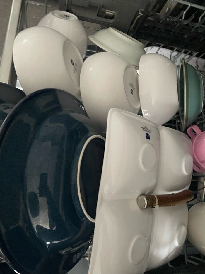 부끄럽지만 올려봅니다. 저흰 이날 카레를 해 먹었어요. 그래서 흰 그릇에 카레 자국이 엄청 많죠? 전 애벌 설거지 따로 하지 않고 바로 넣습니다. 설거지하고 신세기 넣을 바에 왜 식세기 쓰냐는 주의에요. (사실 제가 귀찮습니다.^^)