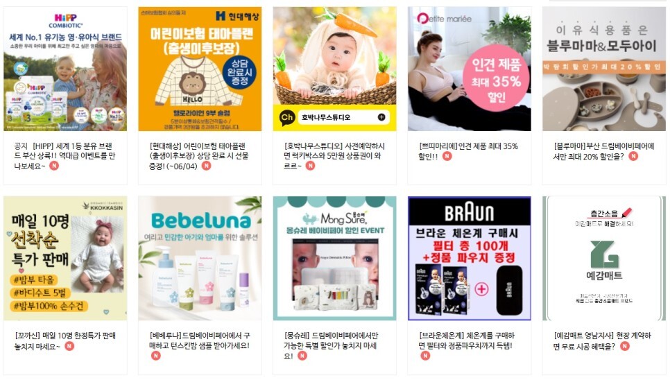 저는 주로 베이비페어 가서 아기 때엔 아기 띠, 유모차, 카시트 등을 구경하고 비교해 보고 구매하였고 기저귀를 샘플 받아와 좋으면 현장에서 구매하거나 인터넷으로 구매하였답니다. 그 후엔 아기 내복 등이 저렴하여 매번 구매하였고 태열 배게, 인견이불 등은 베이비페어가 가장 저렴했어요. 그리고 나중엔 떡뻥, 아기과자 등도 구매를 많이 하였어요. 시식이 잘돼있어 아기를 먹여보고 잘 먹으면 바로 구매하였죠. 이렇게 다니다 보면 아기도 즐겁고 저도 즐겁고 공부도 많이 된답니다.