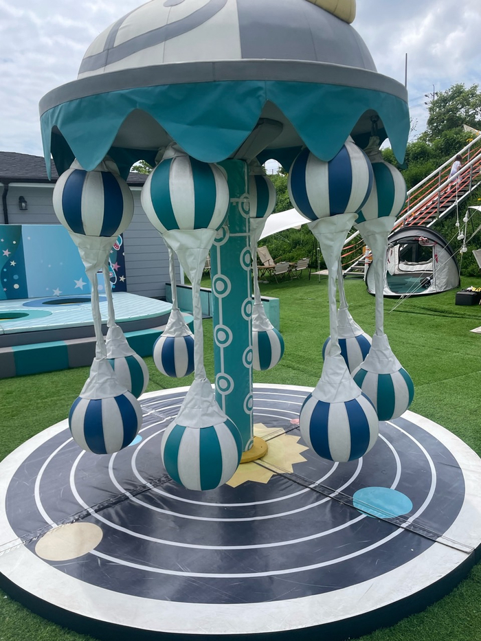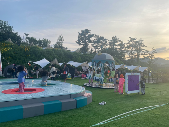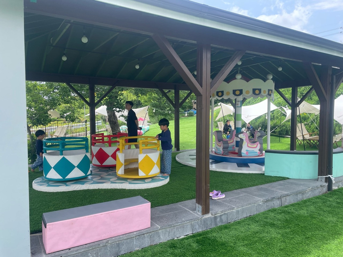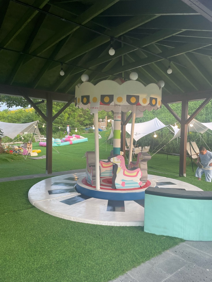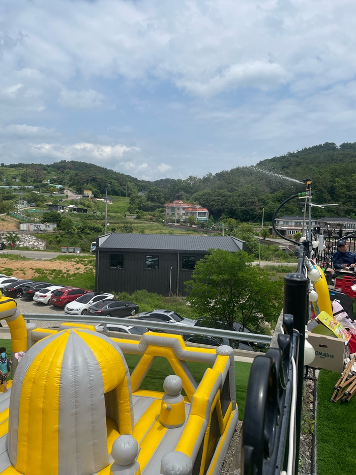 이렇게 피크닉 패키지 광장에 아이들이 마음껏 뛰어놀 수 있는 잔디밭과 함께 놀 수 있는 기구가 있어요. 영유아 아이들은 수영장 물이 차갑고 에어 바운서 이용을 못하니 여기서 잘 놀고 있었답니다. 수영장에서 물놀이 후 옷 갈아입고 여기서 실컷 놀아도 아이들이 재밌어했어요. 비눗방울 꼭 챙겨가서 같이 하세요.