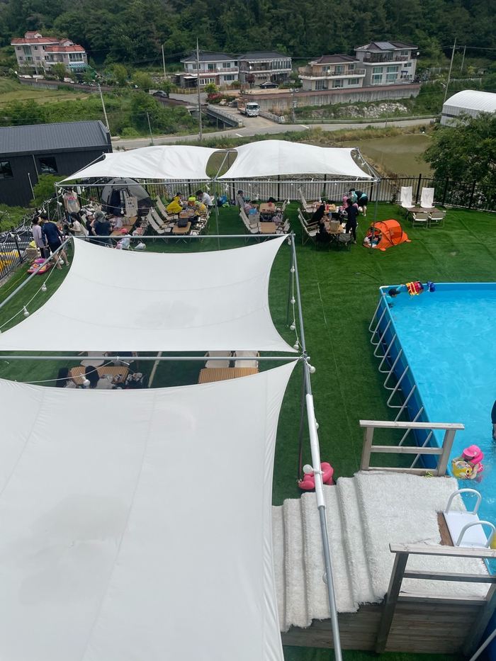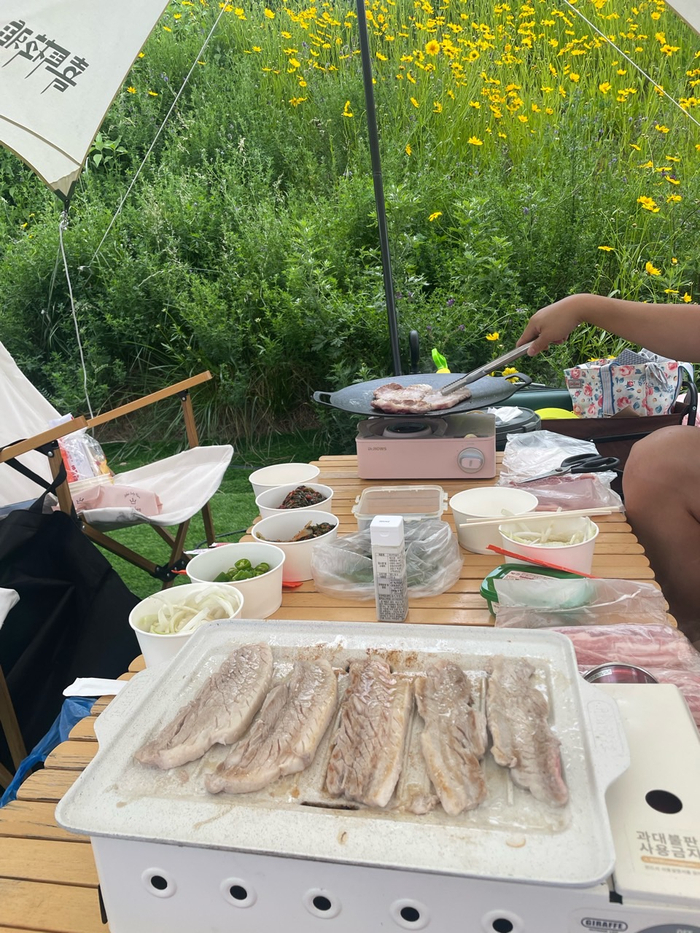 먹는 게 빠질 수 없죠? 앞에서 언급한 것과 같이 구이 바다를 제공해 주고 코펠, 가위, 집게 등 대여해 줍니다. 다만 버너, 부탄가스는 불포함이에요. 부탄가스 꼭 챙겨가셔야 합니다. 먹는 건 거의 세 끼 먹었어요. 점심 먹고 좀 뒤에 떡볶이와 라면 먹고 저녁으로 또 고기 먹고 이렇게 음식을 많이 챙겨가셔야 해요. 다른 분들도 먹을 걸 아주 많이 들고 오시더라고요. 이렇게 다 쓴 그릇들은 깨끗이 씻어 주면 된답니다. 설거지하는 개수대도 따로 있어요. 화로도 이용 가능하지만 저흰 이용하지 않았어요. 물에 안 들어가고 음식 만들며 불 옆에 있고 하니 아주 덥더라고요. 어른들도 에어 바운서, 수영장 이용할 수 있으니 물에 들어갔다 오시는 것도 좋을 것 같네요. 바람이 불긴 하지만 별로 안 불어 가만히 앉아있으면 아주 덥답니다.
