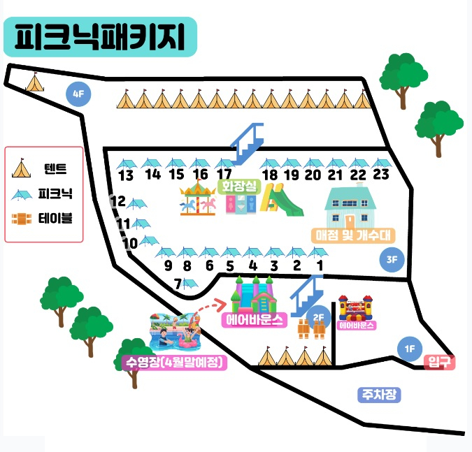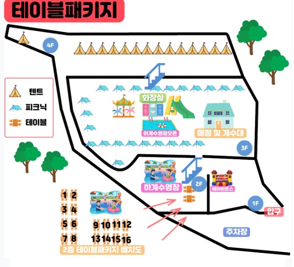 어메이징 캠프는 총 1, 2, 3층으로 나뉜다 생각할 수 있어요. 1층은 에어 바운서와 수영장 그리고 테이블 패키지를 이용할 수 있어요. 2층은 잔디밭에 아이들이 놀 수 있는 미끄럼틀, 퐁퐁, 회전목마 등 뛰어놀 수 있게 되어 있으며 피크닉 패키지가 함께 있습니다. 3층은 텐트 패키지 이용 고객들입니다. 아이들이 놀 수 있는 공간은 따로 없어요. 그래서 텐트 패키지는 조용하게 즐기실 수 있답니다. 저는 피크닉 패키지 22번을 예약하고 갔어요. 가서 보니 피크닉 패키지는 1~6번이 명당인 것 같아요. 공간도 넓고 아이들이 한 눈에 다 보입니다. 그리고 바로 아래 수영장이 있어 내려다보실 수 있어요. 매점과 화장실도 가깝고요. 대신 아이들이 좀 뛰어다니긴 해도 그만큼 공간이 넓어 충분합니다.