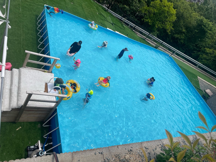 사진만 봤을 때 생각보다 엄청 커 보였는데 막상 보니 좀 작아 보였습니다. 특히 2층의 잔디밭이 작아 보였어요. 에어 바운서, 수영장의 크기는 아주 만족스럽습니다. 그래도 하루 종일 놀고먹고 즐길 수 있어 좋아 보이네요. 입구의 문구처럼 아이들이 놀다 지쳐 쓰러져 잘 잤으면 좋겠습니다.