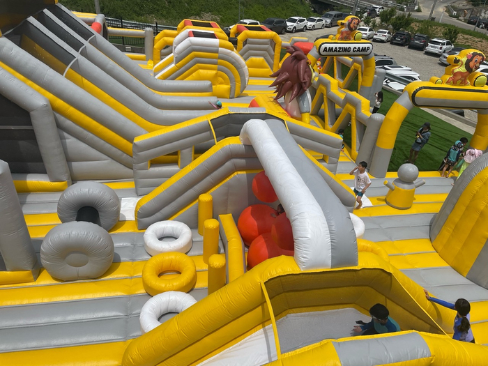 1층의 에어 바운서입니다. 어마어마한 규모의 에어 바운서네요. 슬라이드도 다양해 아이들이 놀기 좋아 보였답니다. 어른도 들어갈 수 있어요. 햇빛에 달구어져 뜨거우니 이렇게 여름엔 스프링클러로 물을 계속 뿌려줘요. 그래서 에어 바운서 안에는 물이 흥건하답니다. 그래서 더 시원하게 놀 수 있어요. 여기선 래시가드, 모자 필수네요. 햇빛을 가려줄 만한 게 하나도 없어 보입니다. 여기선 특히 남자아이들이 아주 신나게 노는 데 좀 어린아이들은 조심해야겠어요. 일단 안전요원이 없어서 슬라이드 타는 아이와 부딪히는 사고가 계속 일어납니다. 그리고 아이들이 워낙 신나서 뛰어다니다 보니 마찬가지 부딪히는 사고가 계속 일어났어요. 메인 슬라이드 쪽에는 보호자 또는 직원들이 질서 있게 아이들이 내려올 수 있도록 통제가 필요해 보였습니다.
